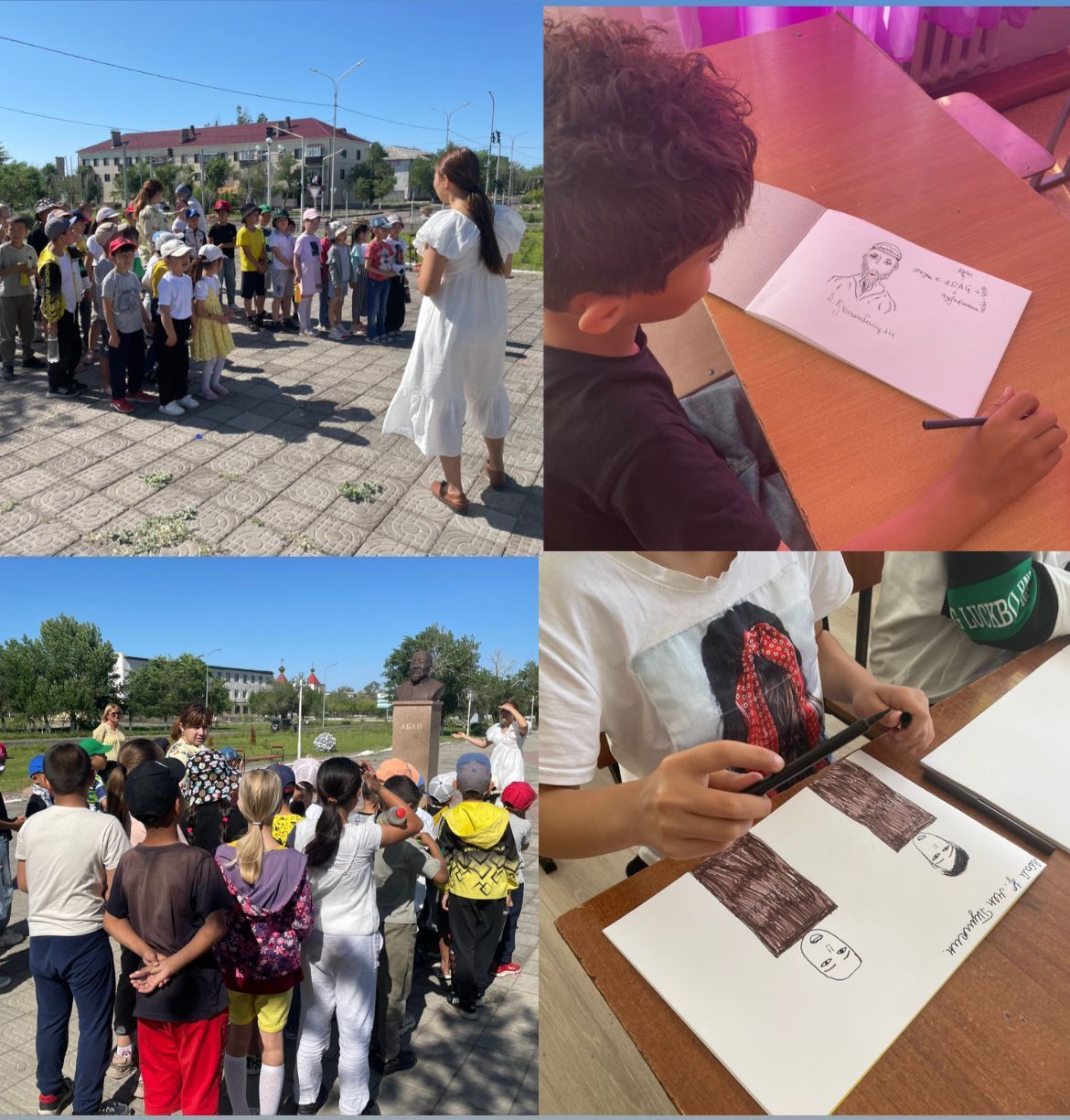 Ребята лагеря посетили памятники А. Кунанбаеву и А. Пушкину. В ходе поездки ребята познакомились с биографиями Абая Кунанабаева и А. Пушкина. Цель: популяризация богатого наследия вел…