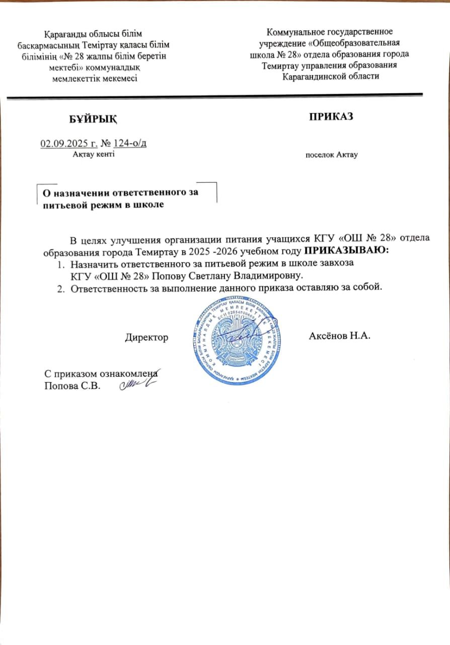 Приказ о назначении ответственного за питьевой режим в школе