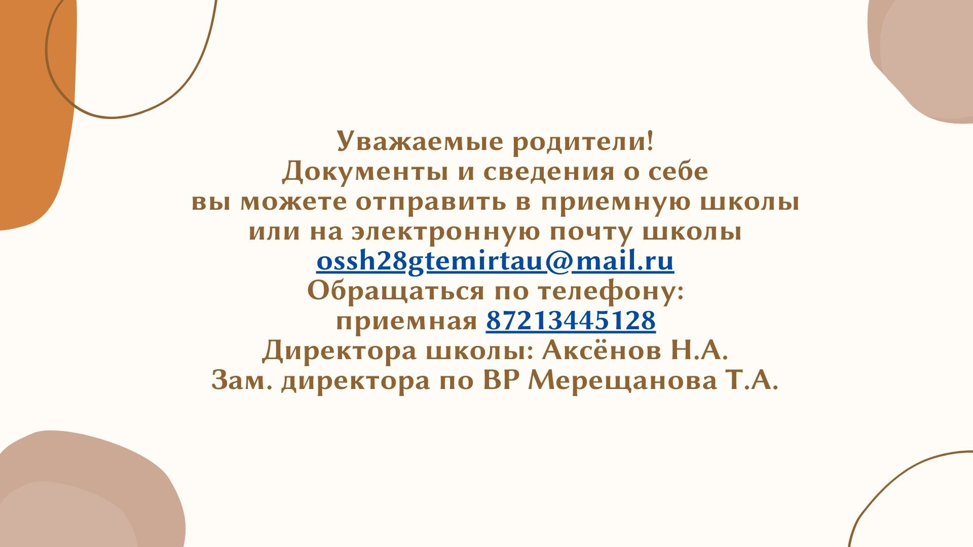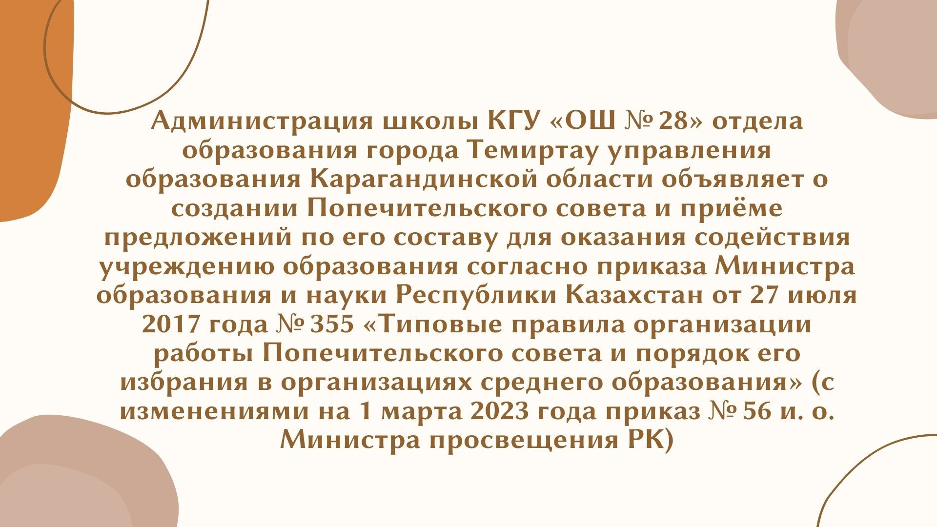 Администрация школы КГУ «ОШ № 28» отдела образования города Темиртау управления образования Карагандинской области объявляет о создании Попечительского совета и приёме предложений по его…