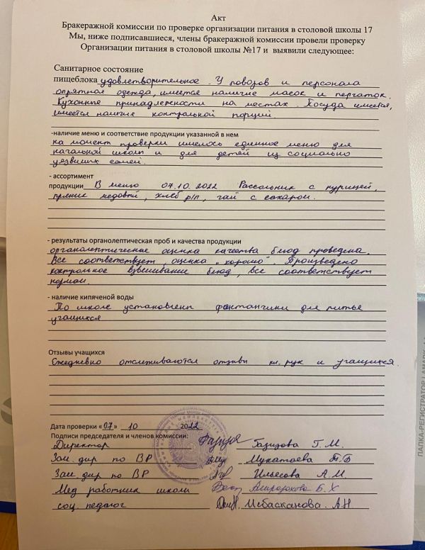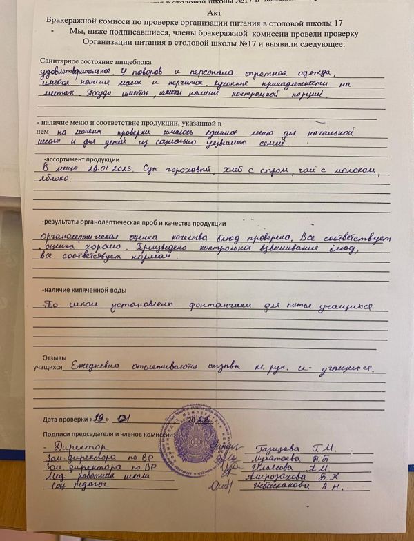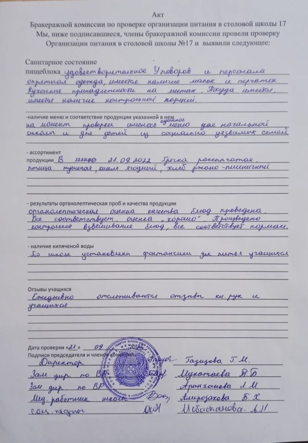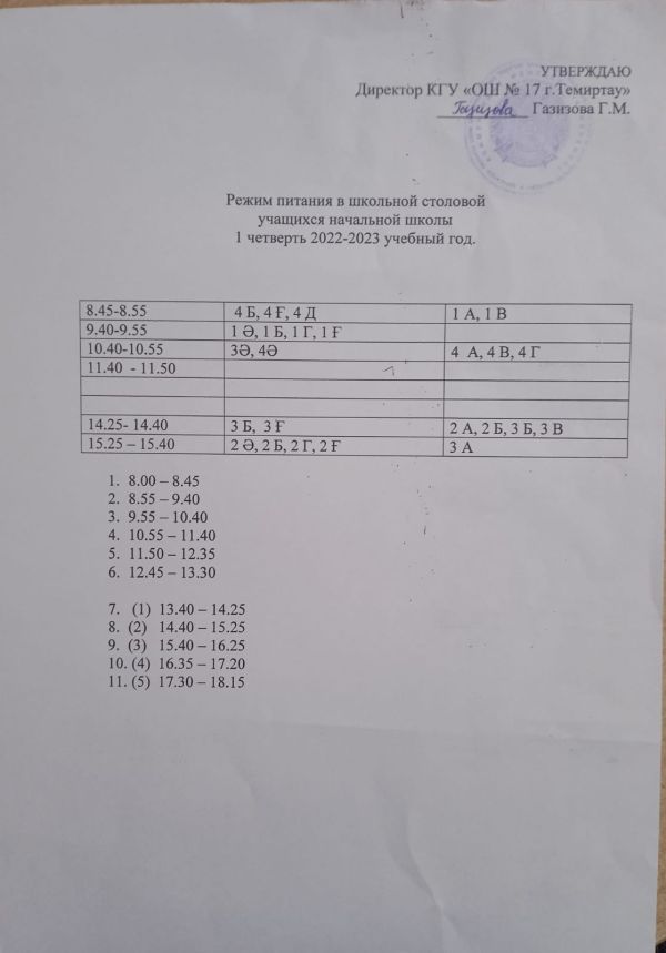 Организация питание в КГУ "ОШ №17"  на 2022-2023 учебный год