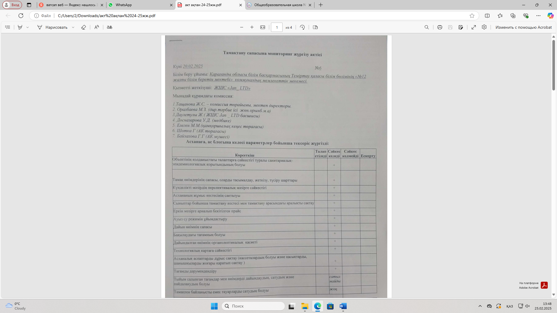 29.02.2025ж.күні Оқушылардың тамақтану сапасын нығайту мақсатында тамақтану сапасының мониторингісі мен бракераждық комиссия мүшелерінің қатысуымен тамақтану залының санитарлық тазалығы, бүгінгі ас…