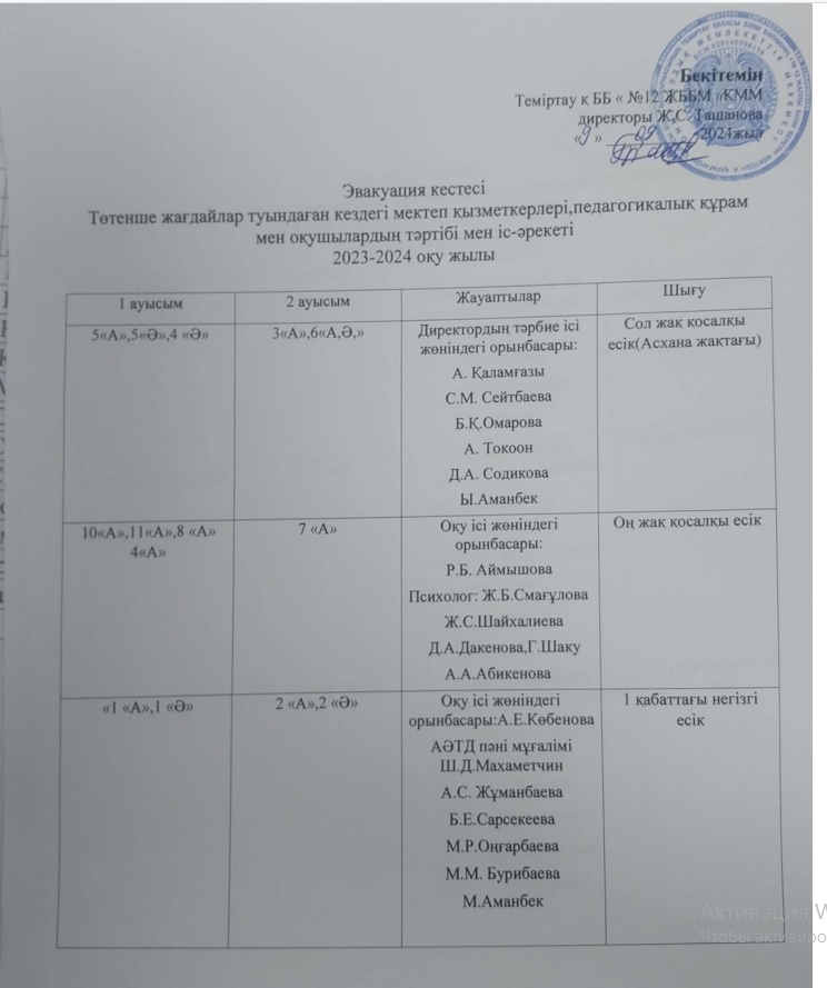 Төтенше жағдайлар туындаған кездегі мектеп қызметкерлері, педагогикалық құрам мен оқушылардың тәртібі мен іс әрекеті
