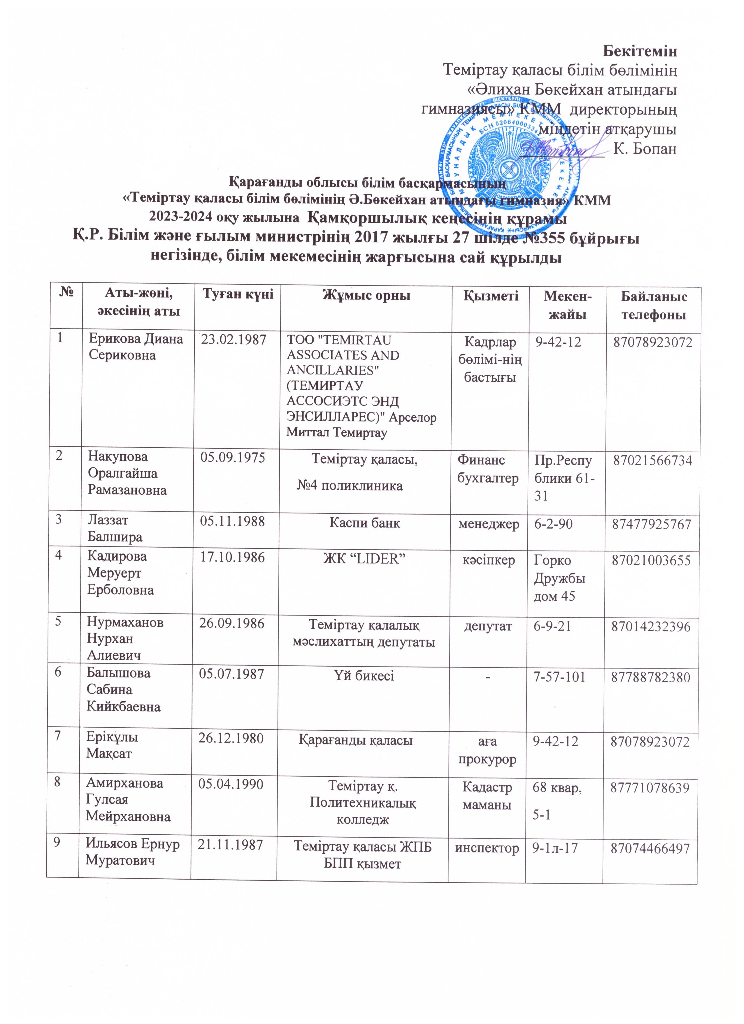 Қамқоршылық кеңесі 9 адамнан тұрады. Төрайымы: Ерикова Диана Сериковна, хатшысы: Лаззат Балшира