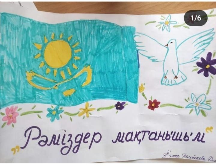 Рәміздерім мақтанышым" тақырыбында суреттер салғыза отырып, рәміздерді құрметтеуді, өз Отанына деген сүйіспеншіліктерін арттыра отырып, туған жері мен елін сүюге ұлтжандылыққа тәрбиелеу