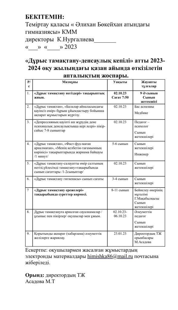 2023-2024 оқу жылындағы қазан айында "Дұрыс тамақтану" апталығының жоспары