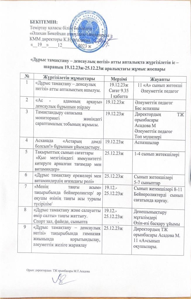 2023 жылдың желтоқсан айында гимназия оқушыларына "Дұрыс тамақтану-денсаулық кепілі" тақырыбында апталық өткізіліп, ақпарат берілді.