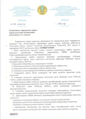 2023-2024 оқу жылында гимназияда терроризмге қарсы қорғалуды және қауіпсіздікті қамтамасыз ету бұйрығы
