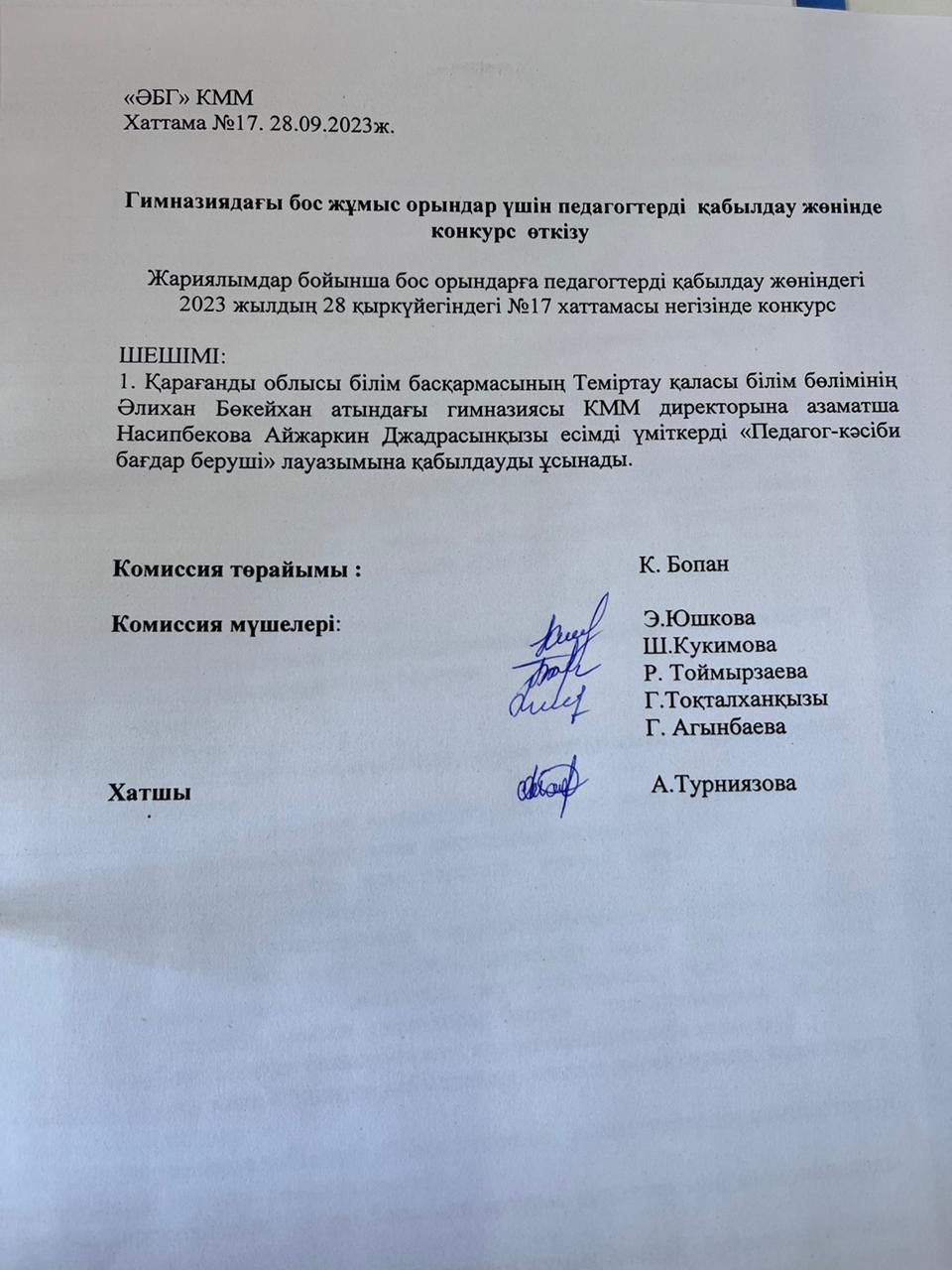 «ӘБГ» КММ Хаттама №17. 28.09.2023ж.     Гимназиядағы бос жұмыс орындар үшін педагогтерді  қабылдау жөнінде конкурс  өткізу   Жариялымдар бойынша бо…