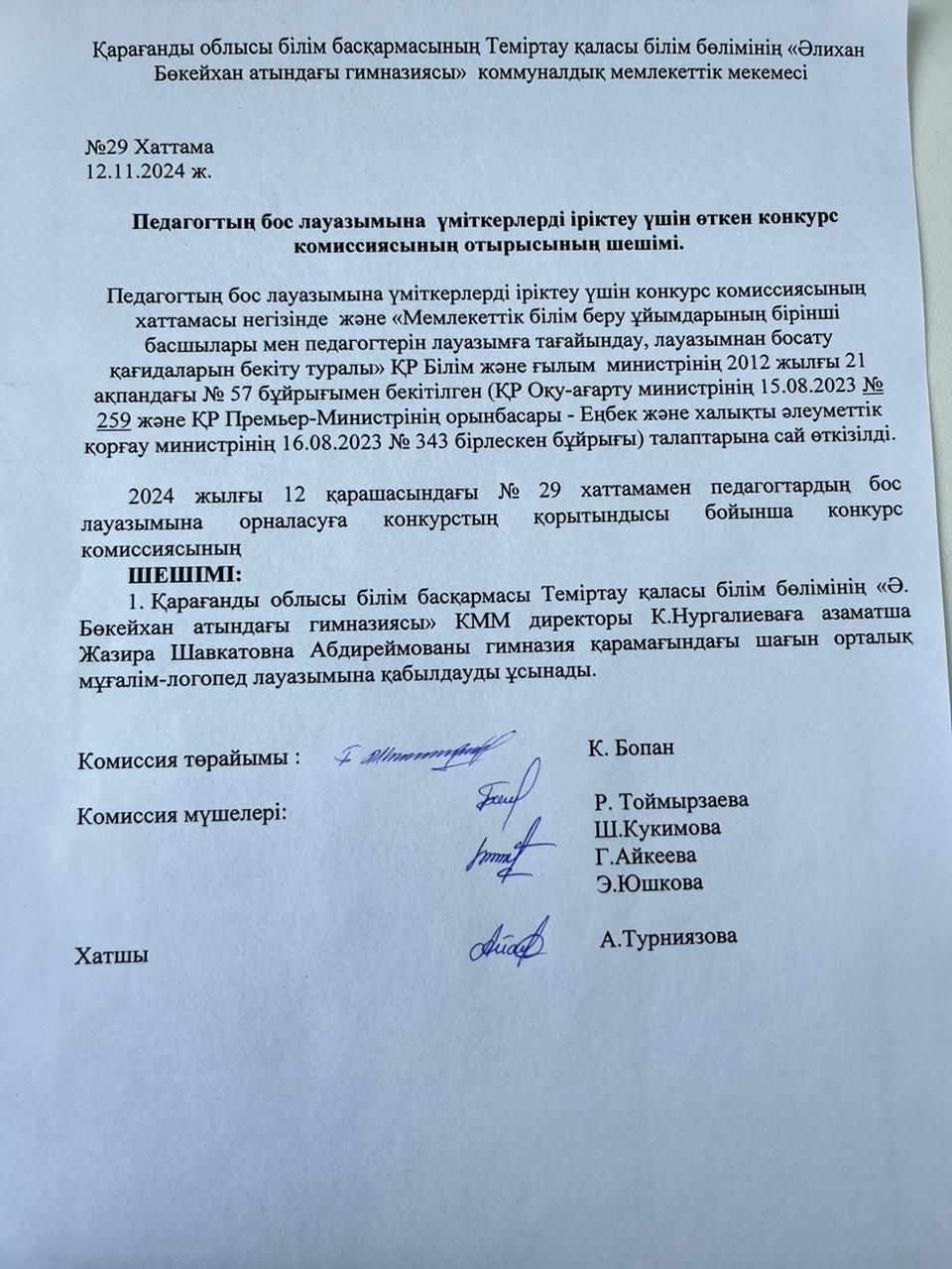 №29 Конкурс 12.11.2024 ж. Педагогтың бос лауазымына үміткерлерді іріктеу үшін өткен конкурс комиссиясының отырысының шешімі.