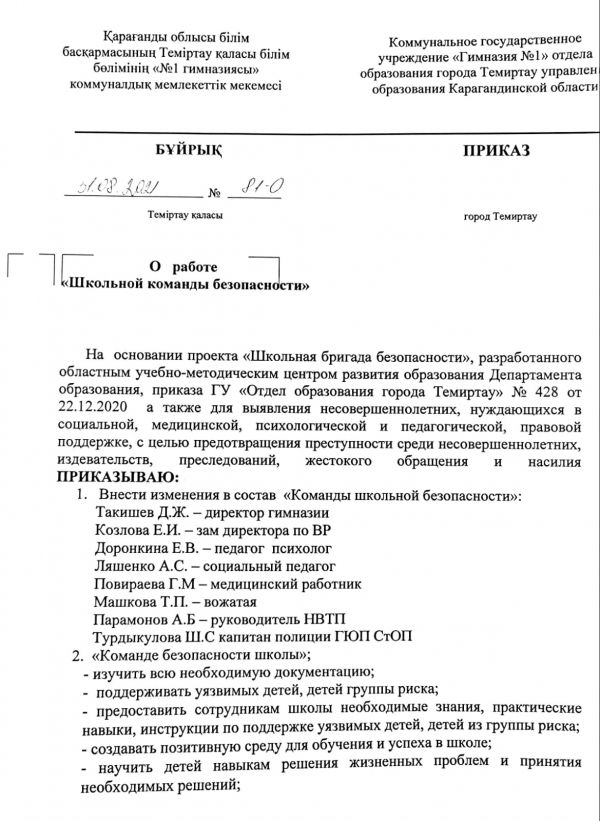 Администрация КГУ «Гимназия №1» ООг. Темиртау УО Карагандинской области руководствуясь п. 5 приказа Министра образования и н…
