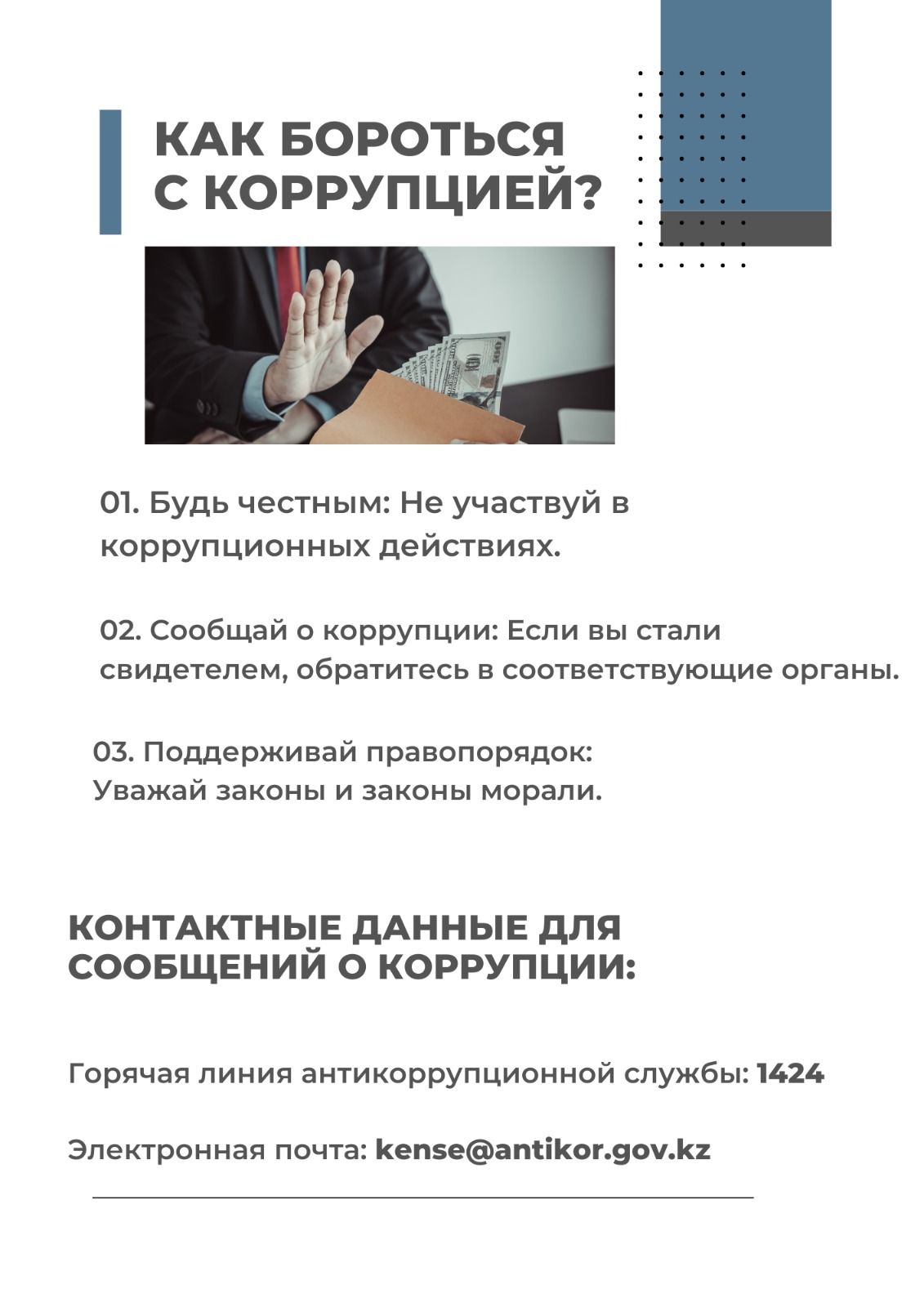 Мектеп ортасында сыбайлас жемқорлыққа қарсы мәдениетті қалыптастыру, сыбайлас жемқорлыққа төзбеушілікті көрсететін құндылықтар жүйесін сақтау және нығайту, оның ішінде мектеп оқушыларында заң талапт…