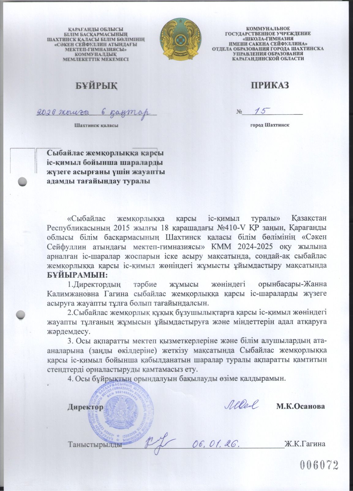 Приказ "О назначении ответственного лица по противодействию коррупции" гос. яз.