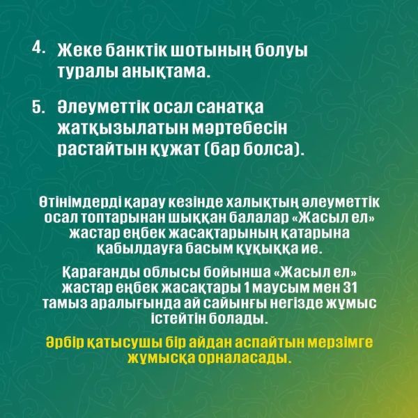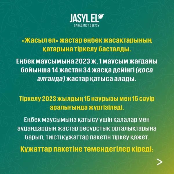 «Жасыл ел» жастар еңбек жасақтарының қатарына тіркелу басталды. Еңбек маусымына 2023 ж. 1 маусым жағдайы бойынша 14 жастан 34 жасқа дейінгі (қоса алғанда) жастар қатыса алады.