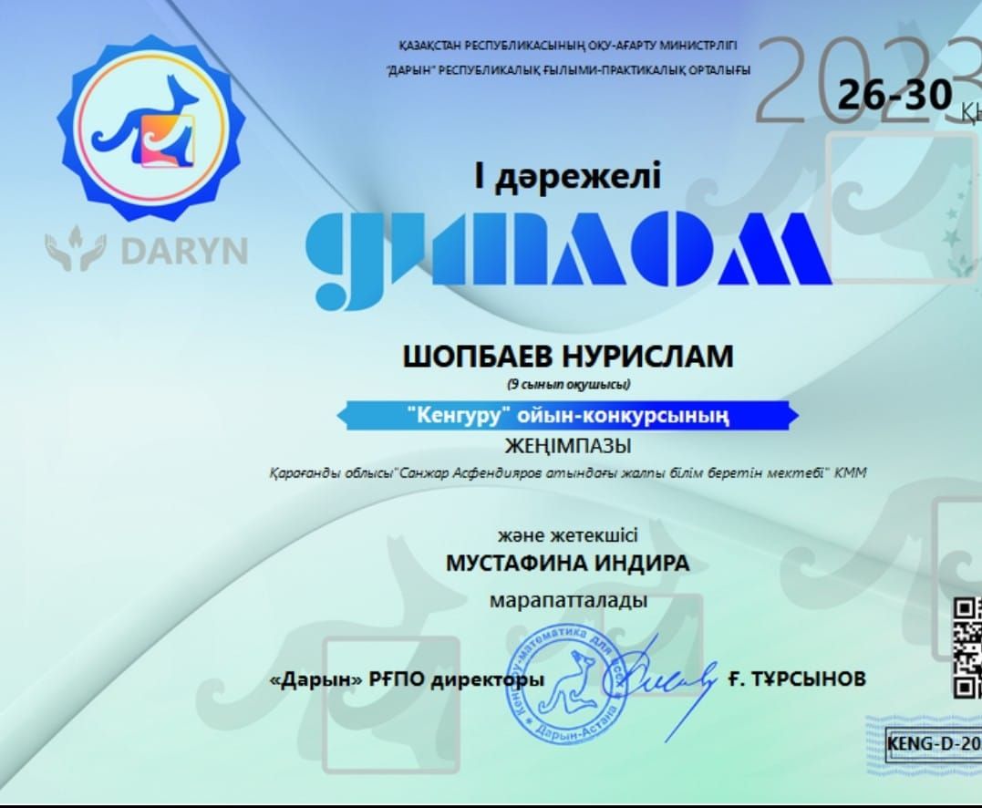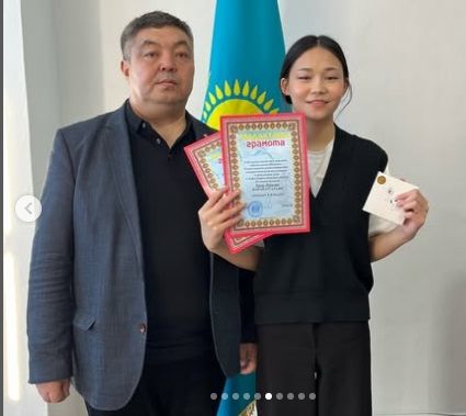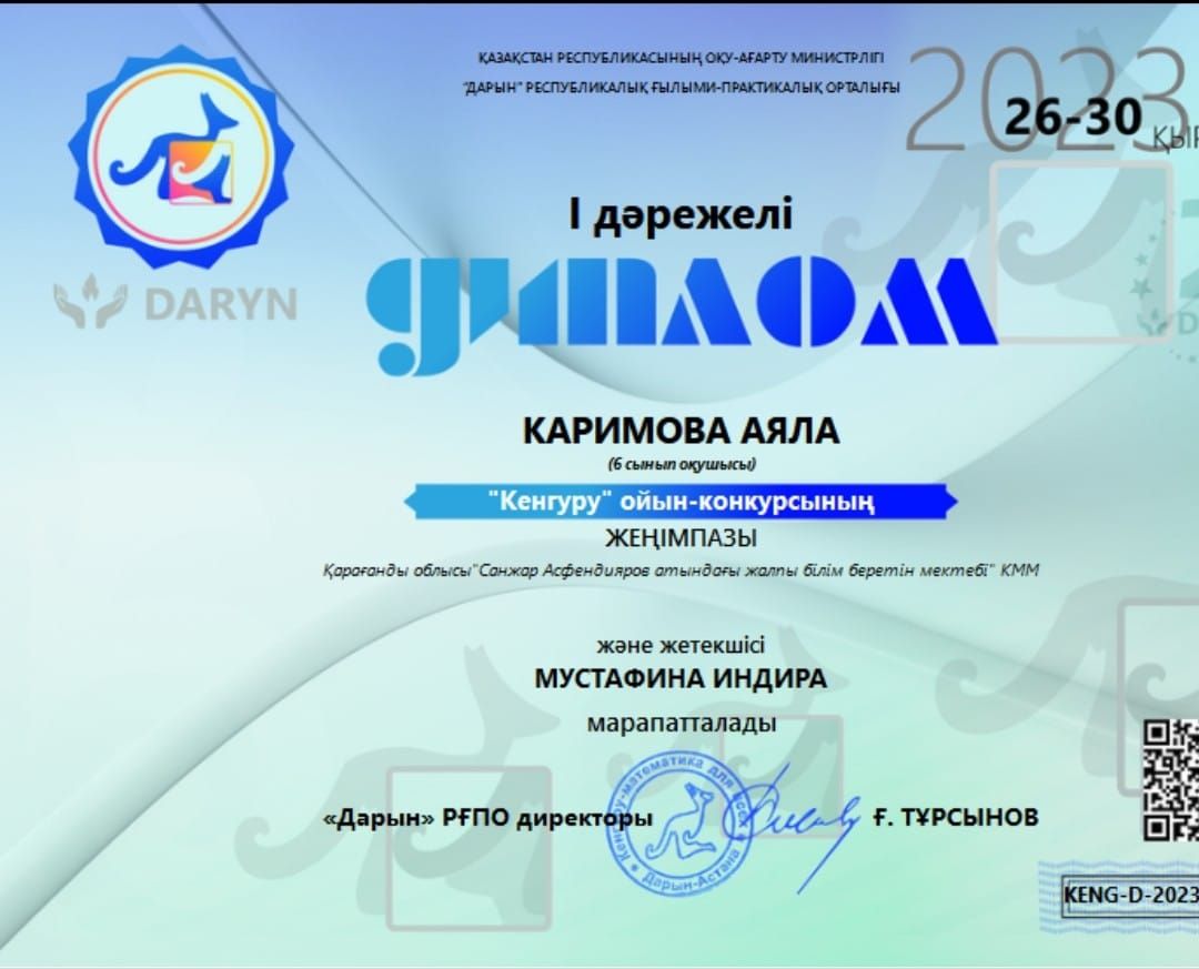 Қазақ тілі пәні бойынша: 5- сынып оқушысы Уринбасарова Айман 3- орын; 6- сынып оқушысы Жаугашбаева Жанс…