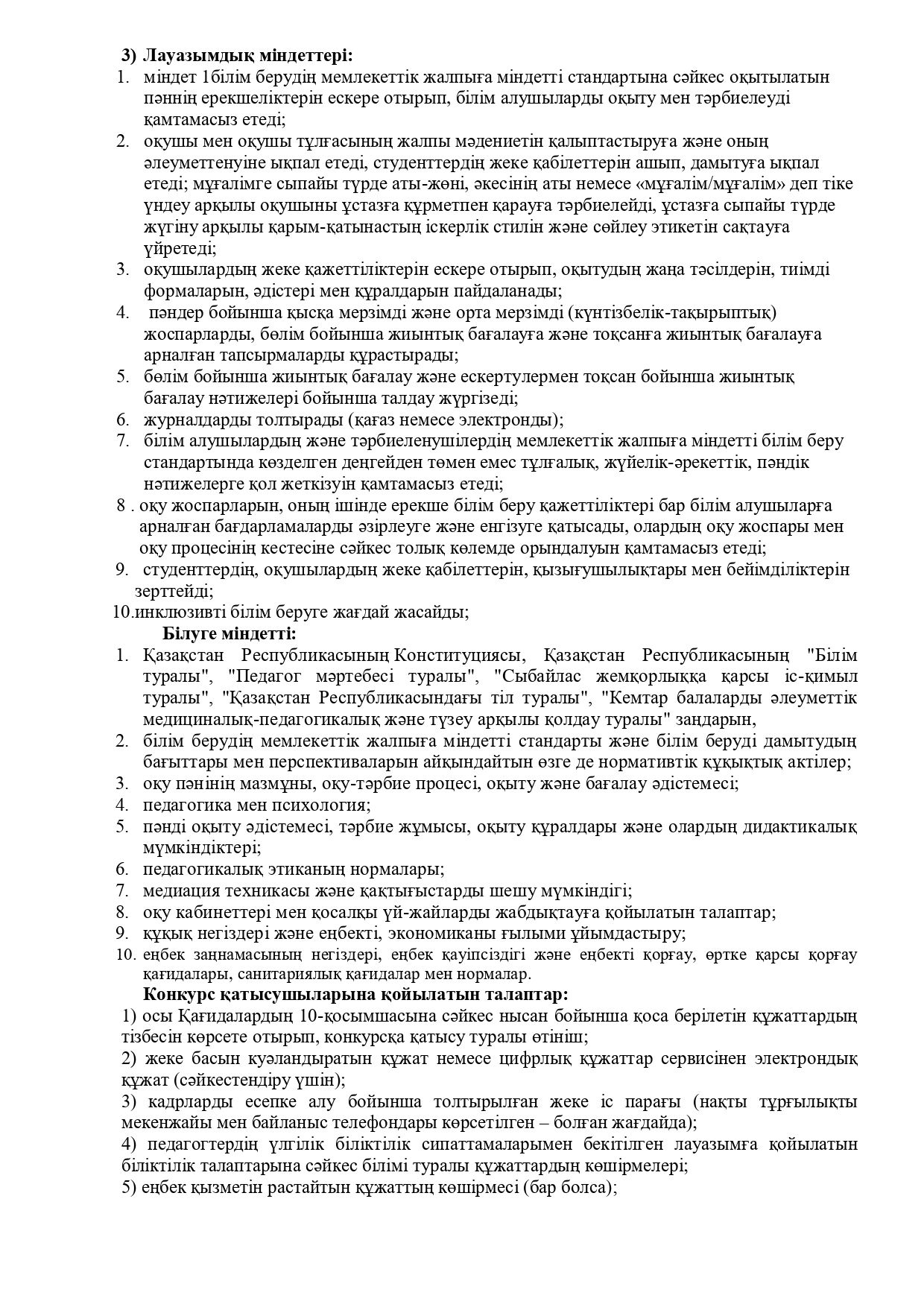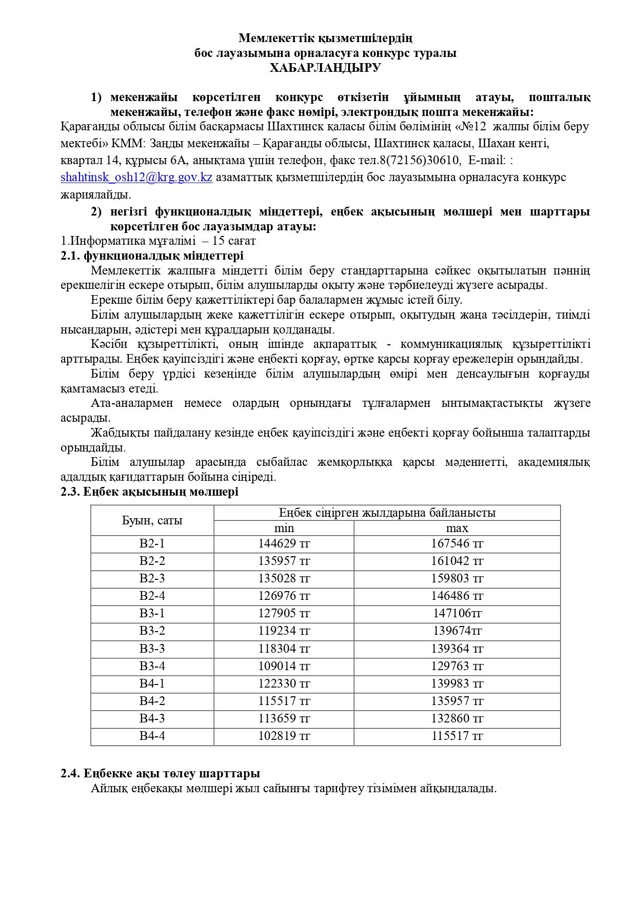 Мемлекеттік қызметшілердің бос лауазымына орналасуға конкурс туралы ХАБАРЛАНДЫРУ Информатика мұғалімі – 15 сағат