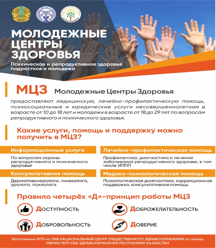 Молодежные центры здоровья (МЦЗ) — предоставляют медицинскую, лечебно-профилактическую помощь, психосоциальные и юридические услуги несовершеннолетним в возрасте от 10 до 18 лет и молодеж…