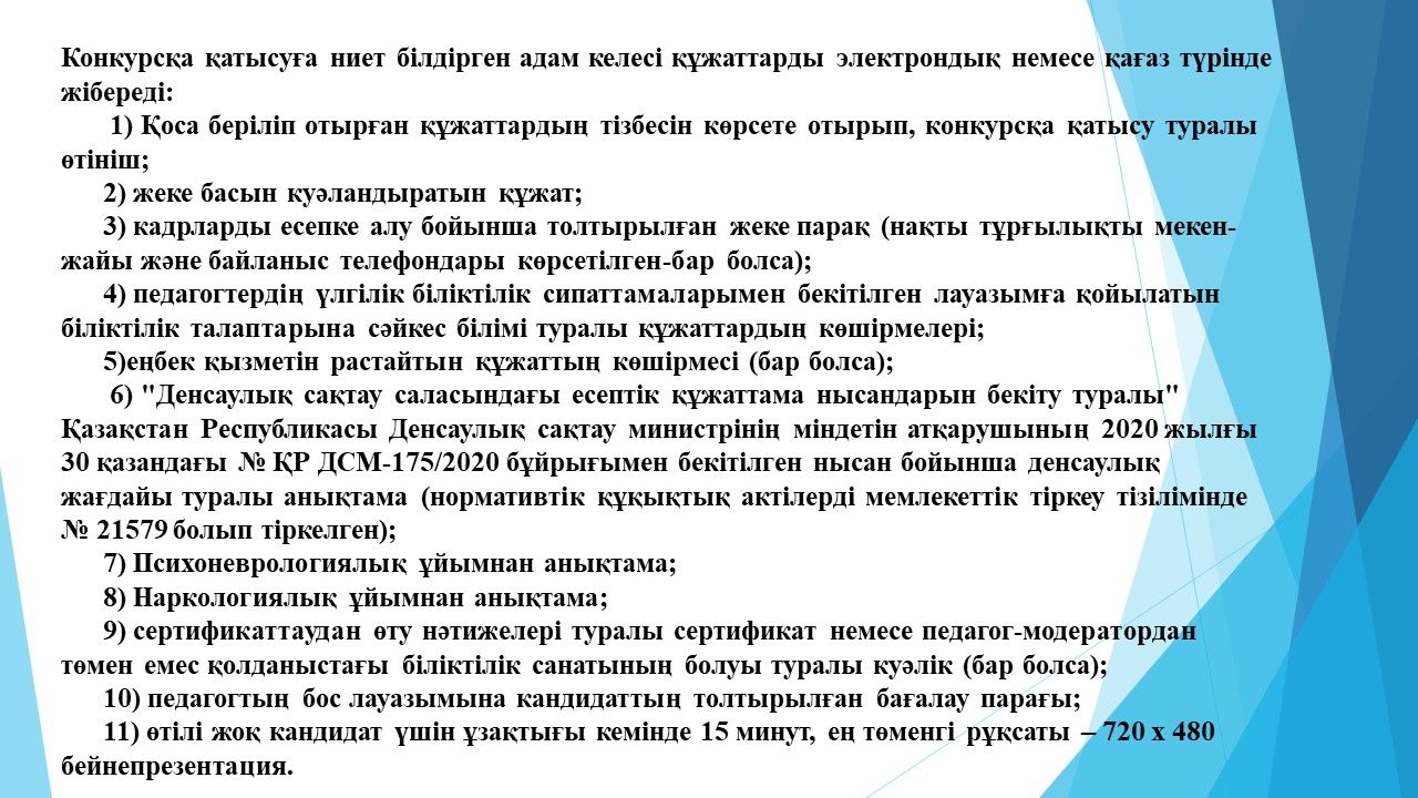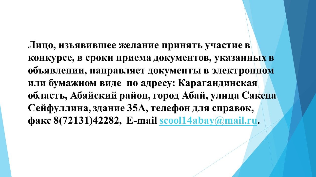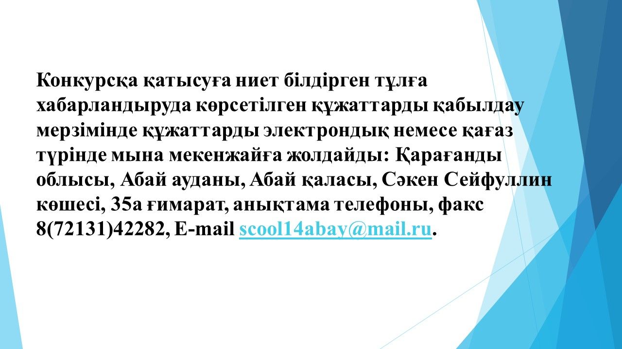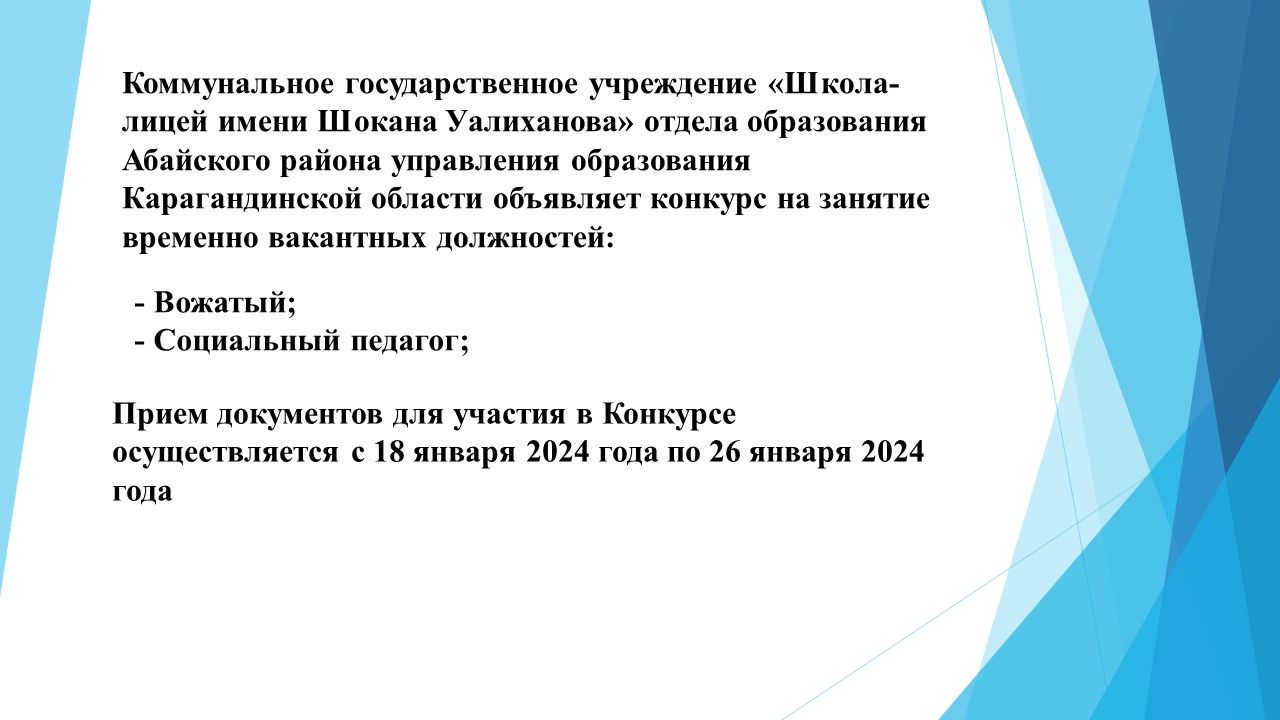 Қарағанды облысы білім басқармасының Абай ауданы білім бөлімінің «Шоқан Уәлиханов атындағы мектеп-лицейі» коммуналдық мемлекеттік мекемесі уақытша бос лауазымдарға орналасуға конкурс жар…