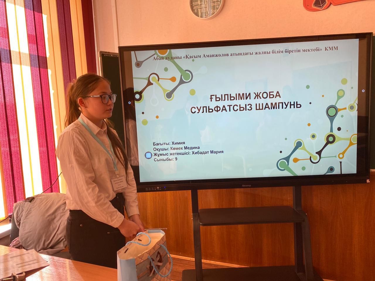 18 қазанда Қарағанды ​​қаласындағы Шәкәрім атындағы мектеп-гимназиясында 9-11 сынып оқушылары арасында ғылыми жобаларды қорғауға арналған республикалық ғылыми-тәжірибелік конференцияның облыстық кезеңі өтті. Абай ауданынан Көмек Медина 9А сыныбы қатысты.