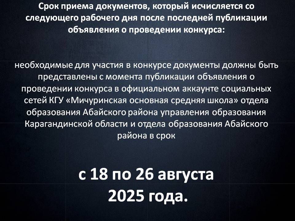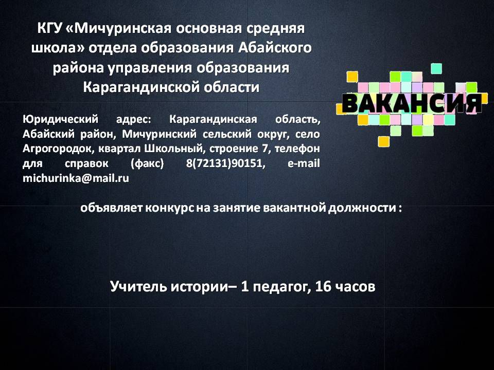 Мичуринская ОСШ объявляет конкурс на занятие вакансии учителя истории