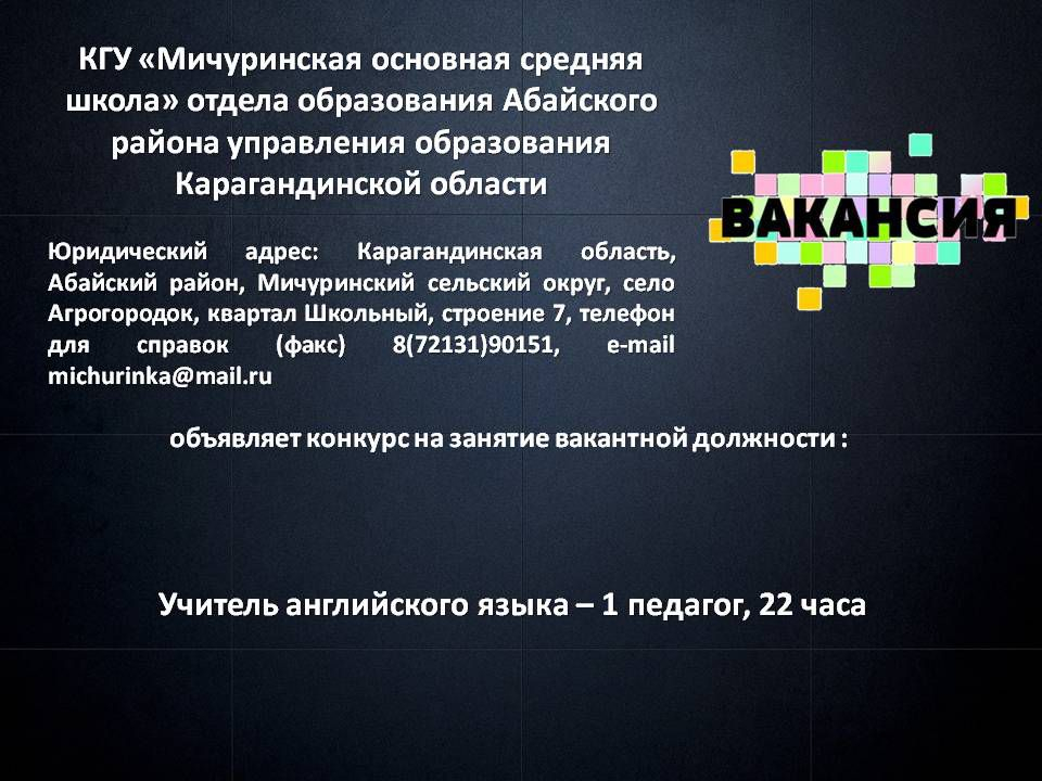 Мичуринская ОСШ объявляет конкурс на занятие вакансии учителя английского языка