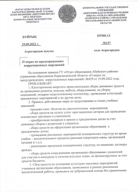О мерах по предупреждению коррупционных нарушений в КГУ "Мичуринская основная средняя школа"