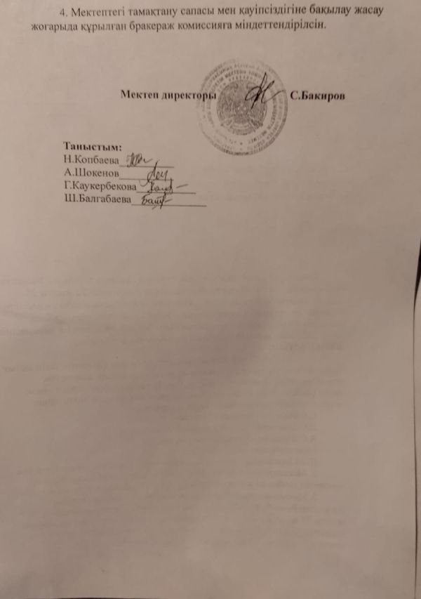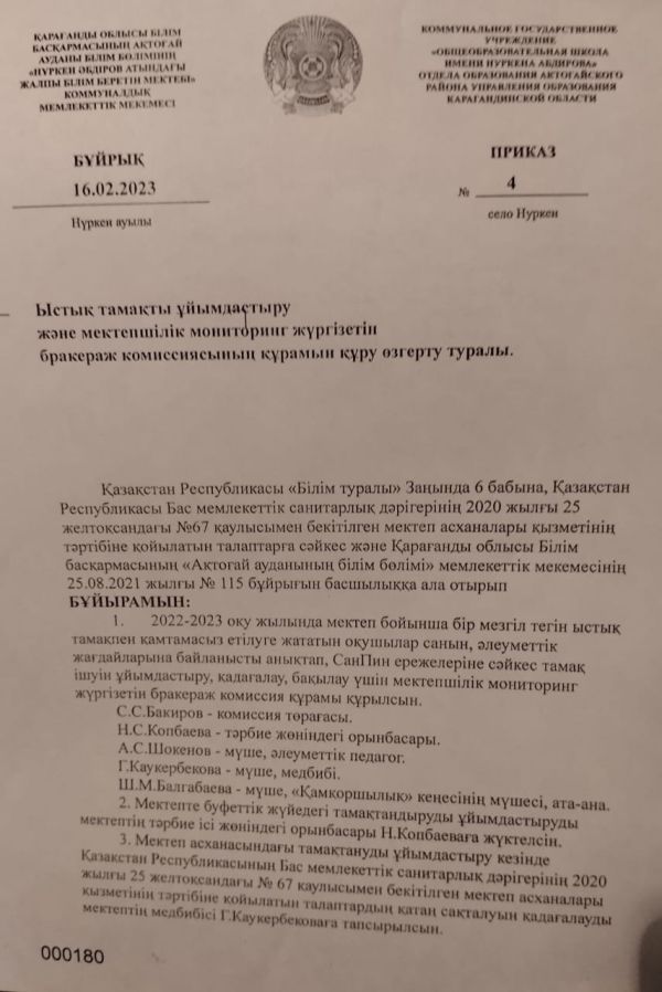 Мектепішілік мониторинг жүргізетін бракераж комиссиясының құрамы туралы бұйрық