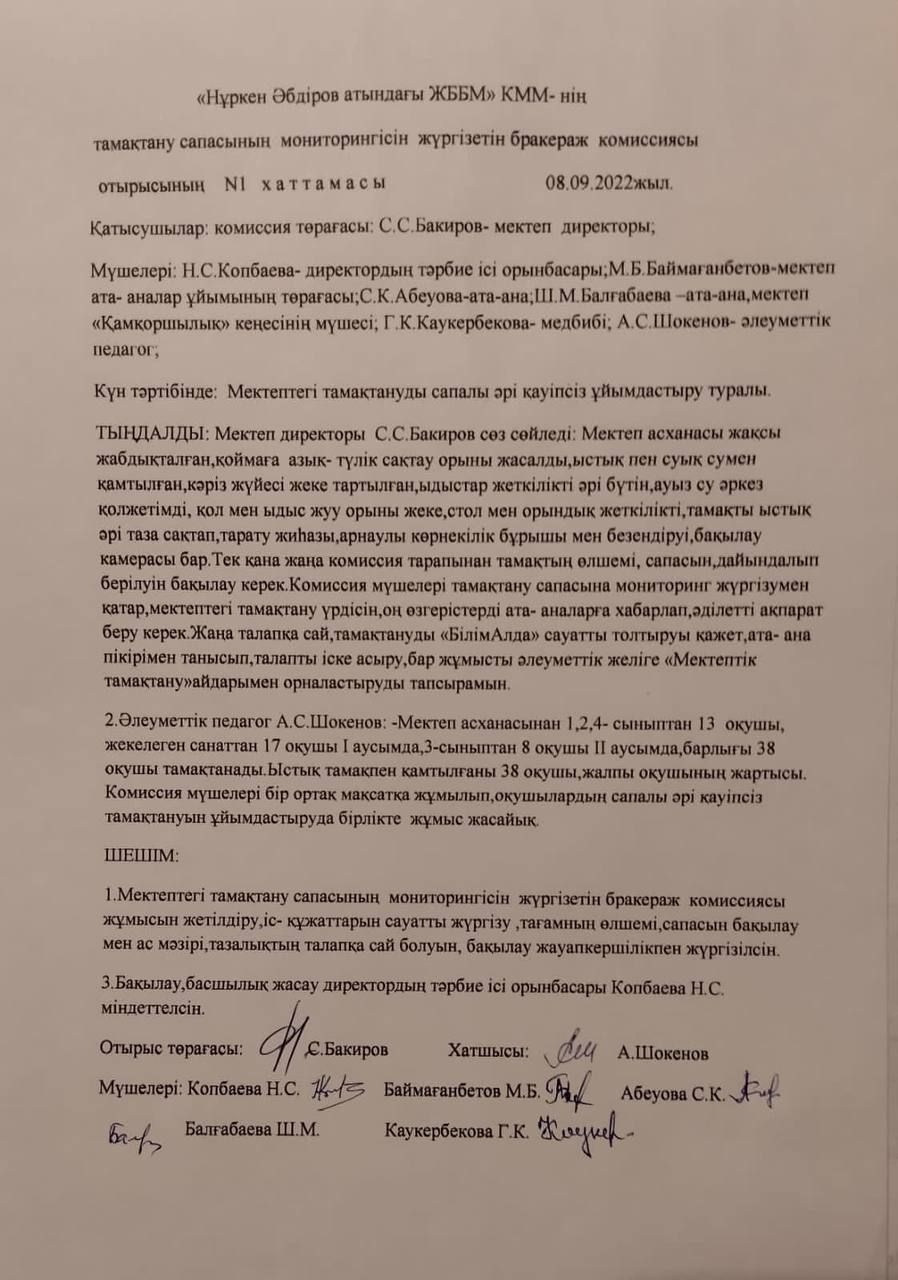 Мектептегі тамақтану сапасының мониторингісін жүргізетін бракераж комиссиясы отырысының хаттамасы