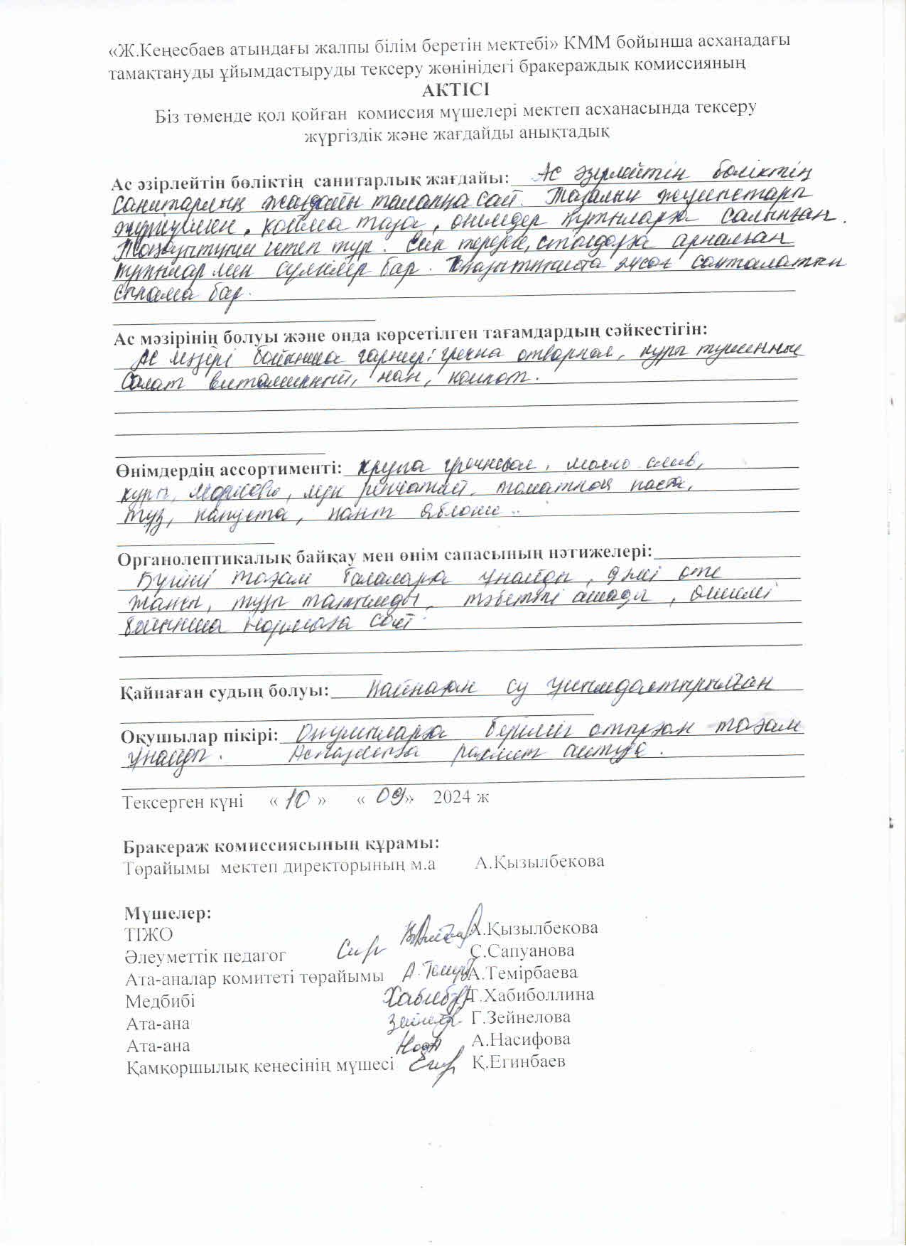 Тамақтануды ұйымдастыруды тексеру Актісі