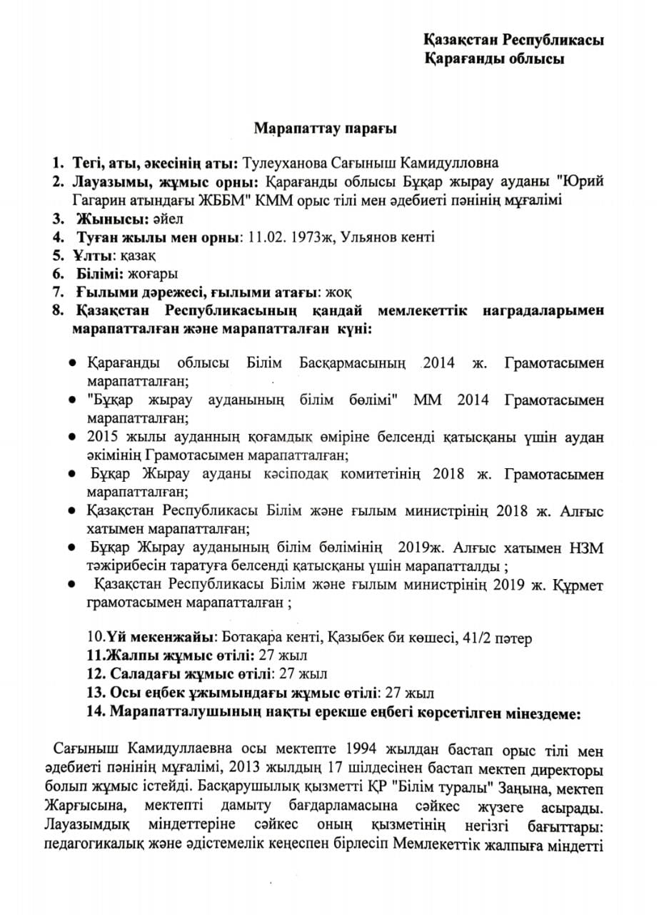 Тамыз педагогикалық конференциясында марапаттауға ұсынылған мұғалімдердің марапаттау қағаздары