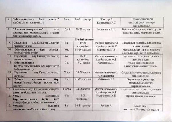 05.03.2024 ж 8-10 сынып қыз балалар арасында жыныстық қолсұғушылықты алдын-алу мақсатында "Ерте жүктілік" тақырыбында бейнеролик көрсетіліп, талқыланып кеңестер берілді.