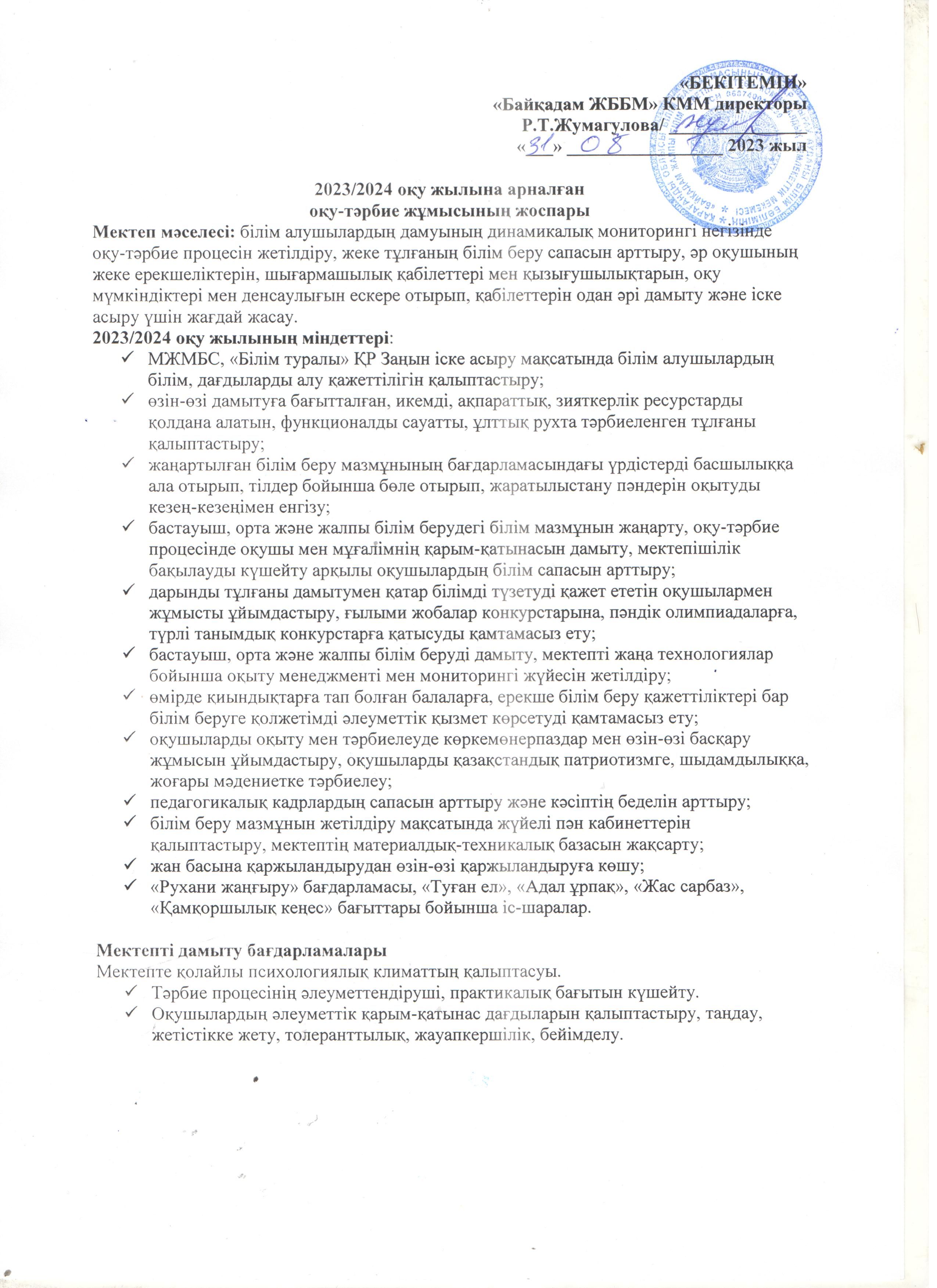 2023/2024 оқу жылына арналған оқу-тәрбие жұмысының жоспары