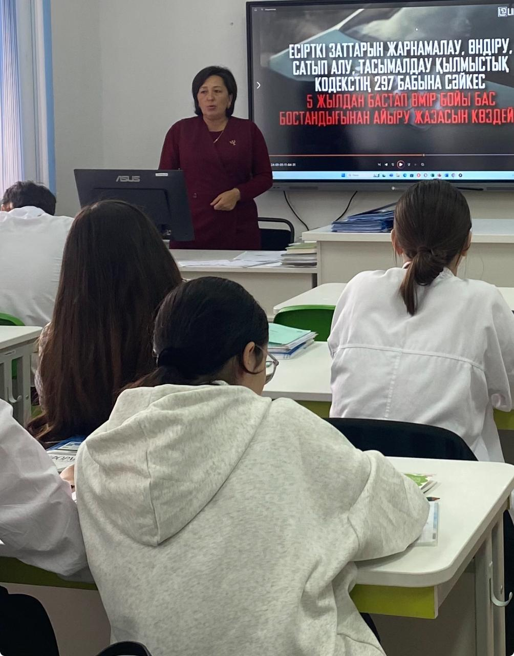 "Нашақорлыққа жол жоқ", "Есірткі-ХХІ ғасырдың дерті" тақырыбында бейнебаян көрсетіліп талқыланып, түсіндіру және кеңес жұмыстары жүргізілді