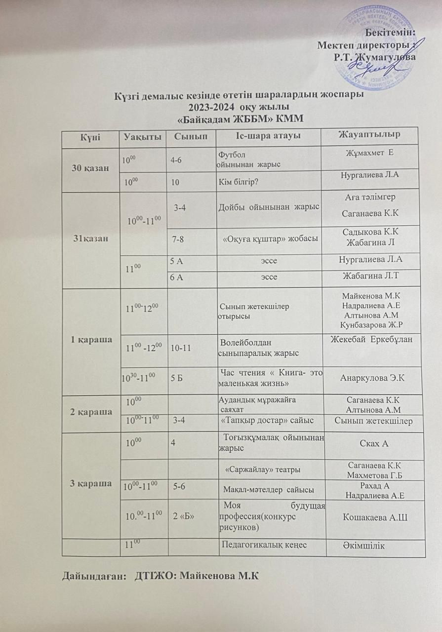 Күзгі демалыс кезінде өтетін шаралардың жоспары
