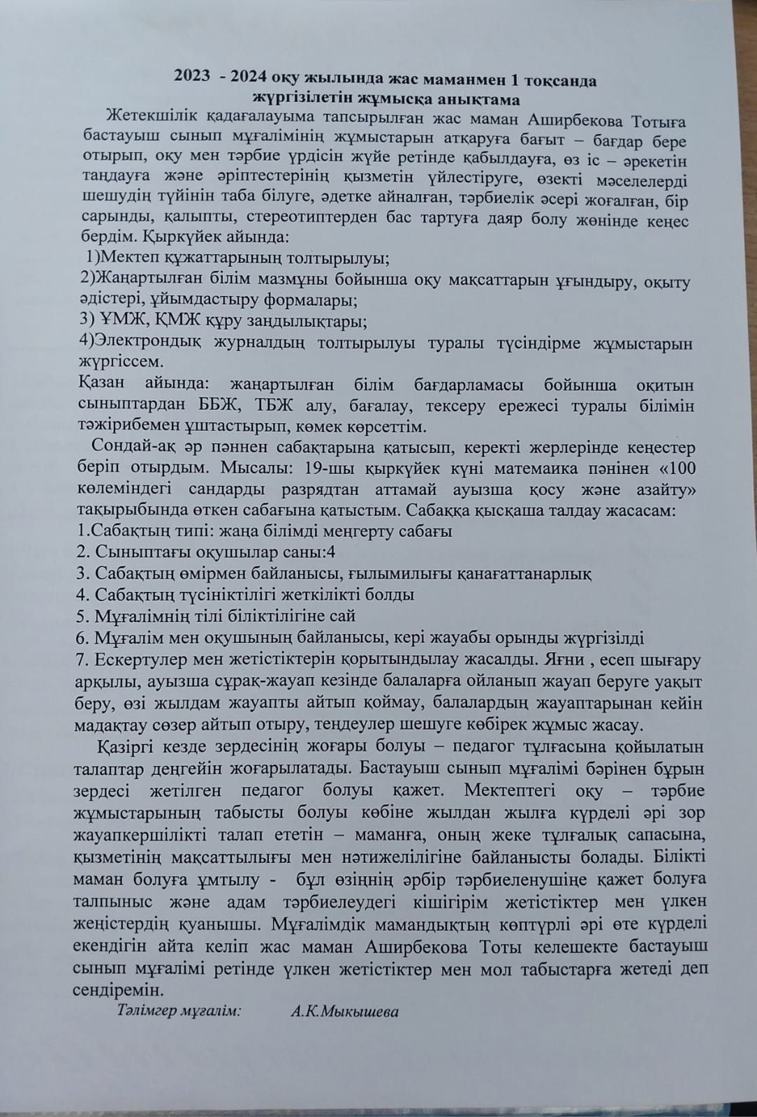 Жетекшілік қадағалауыма тапсырылған жас маман Аширбекова Тотыны сабаққа қойылатын қазіргі талаптарымен таныстыра оырып,  сабаққа қатысу дәптерлерін толтыруды үйреттім. Өз білімін жетілді…