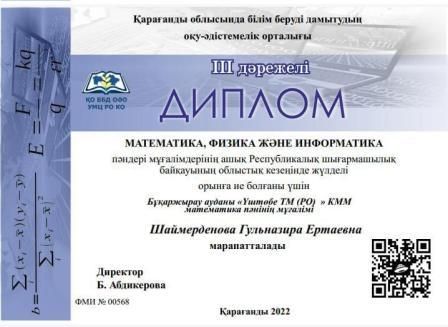 "Академик Е.А. Бөкетов атындағы Қарағанды университеті" КЕАҚ ұйымдастырумен оқушылары арасында биология пәнінен өткізілген аймақтық олимпиадада 10 "А"- сынып оқушысы Тұрсынхан То…
