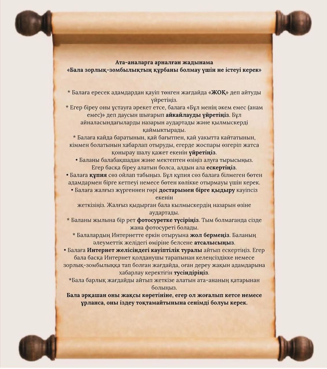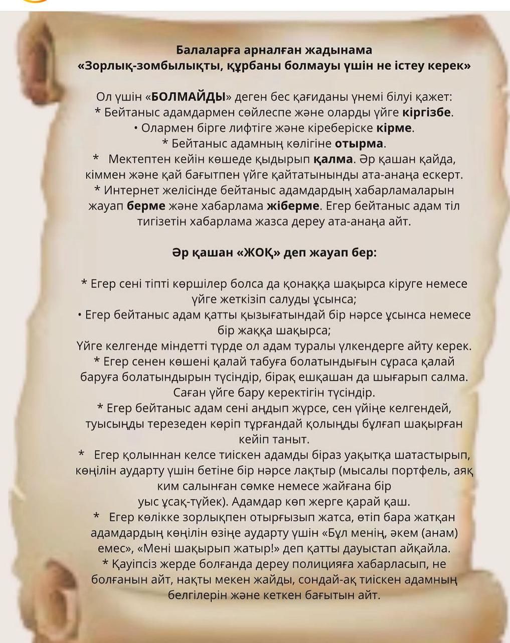 "Зорлық - зомбылықтың құрбаны болмауы үшін не істеу керек" ата-аналарға және оқушыларға арналған жадынама