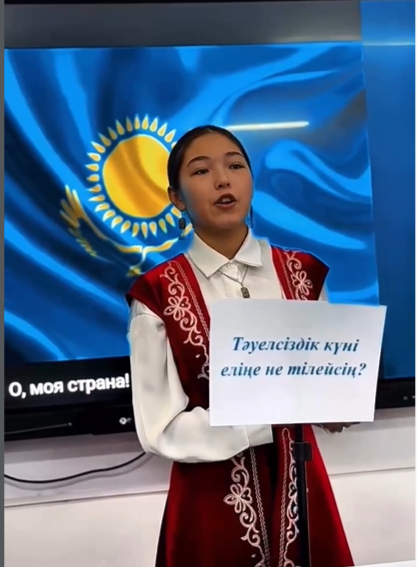 Оқушылар Отанға деген сүйіспеншіліктерін білдіріп, Қазақстанның Әнұранын шырқап, жылы тілектерін арна…