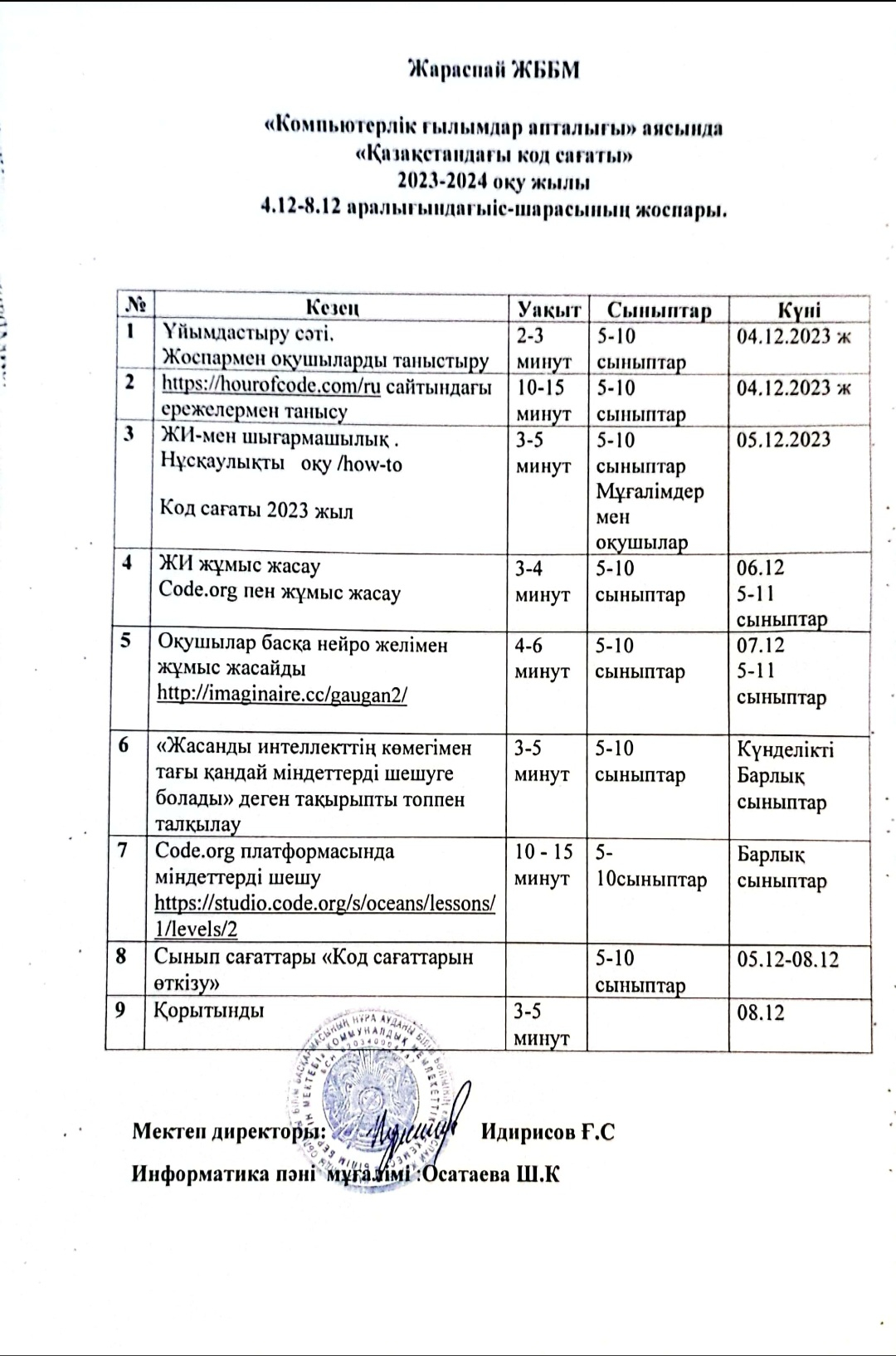 2023 жылдың 04.12. - 08.12. аралығында, Жараспай ЖББ мектебінде, 5-11 сыныптары арасында өткізілетін «Компьютерлік ғылымдар апталығы» аясында «Қазақстандағы код сағаты» атты…
