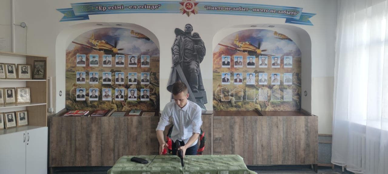 6 мая в честь Дня защитника Отечества в ОШ им.А.Бокейхана среди учащихся 9 класса проведено мероприятие по разборке и сборке автомата Калашникова