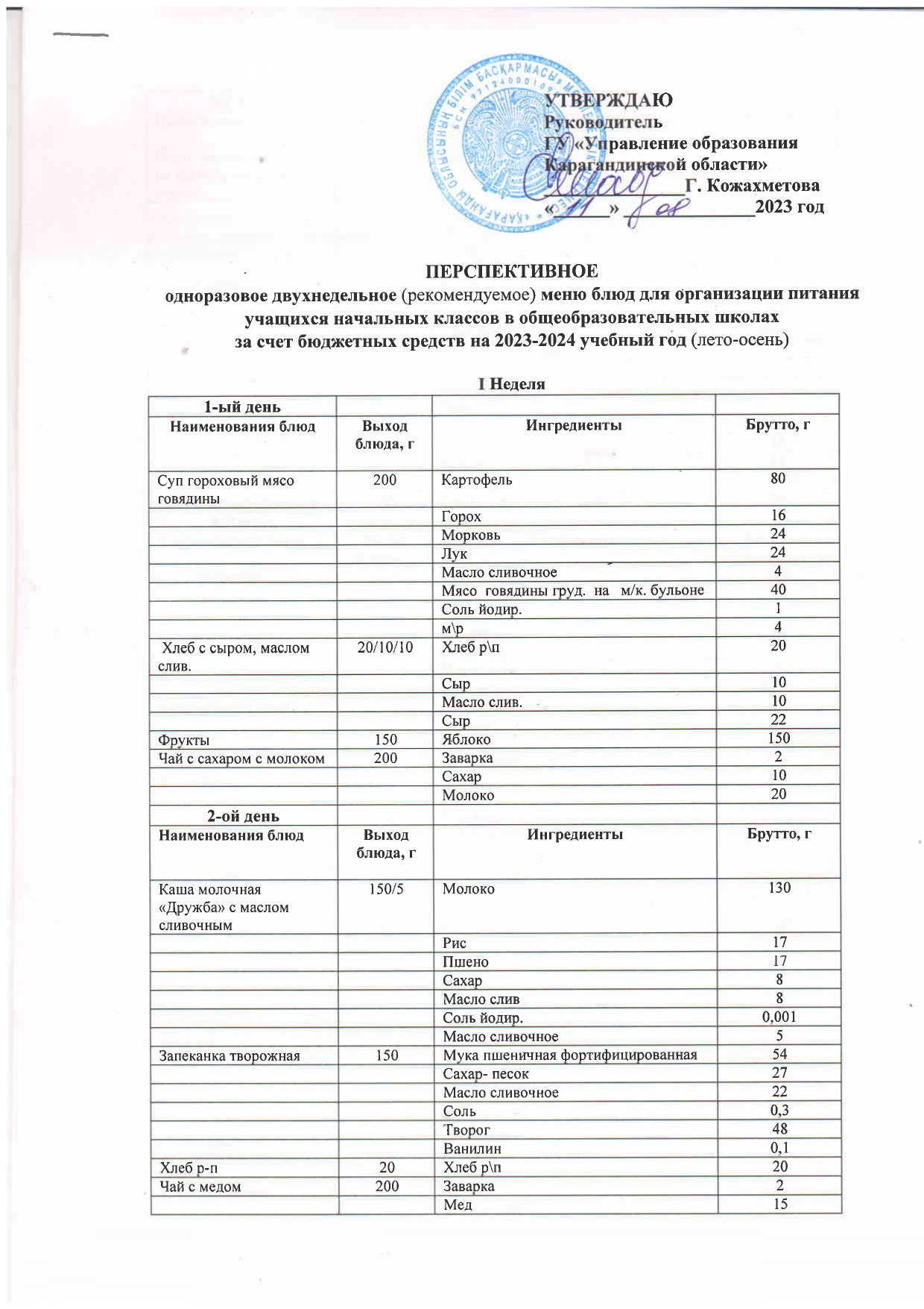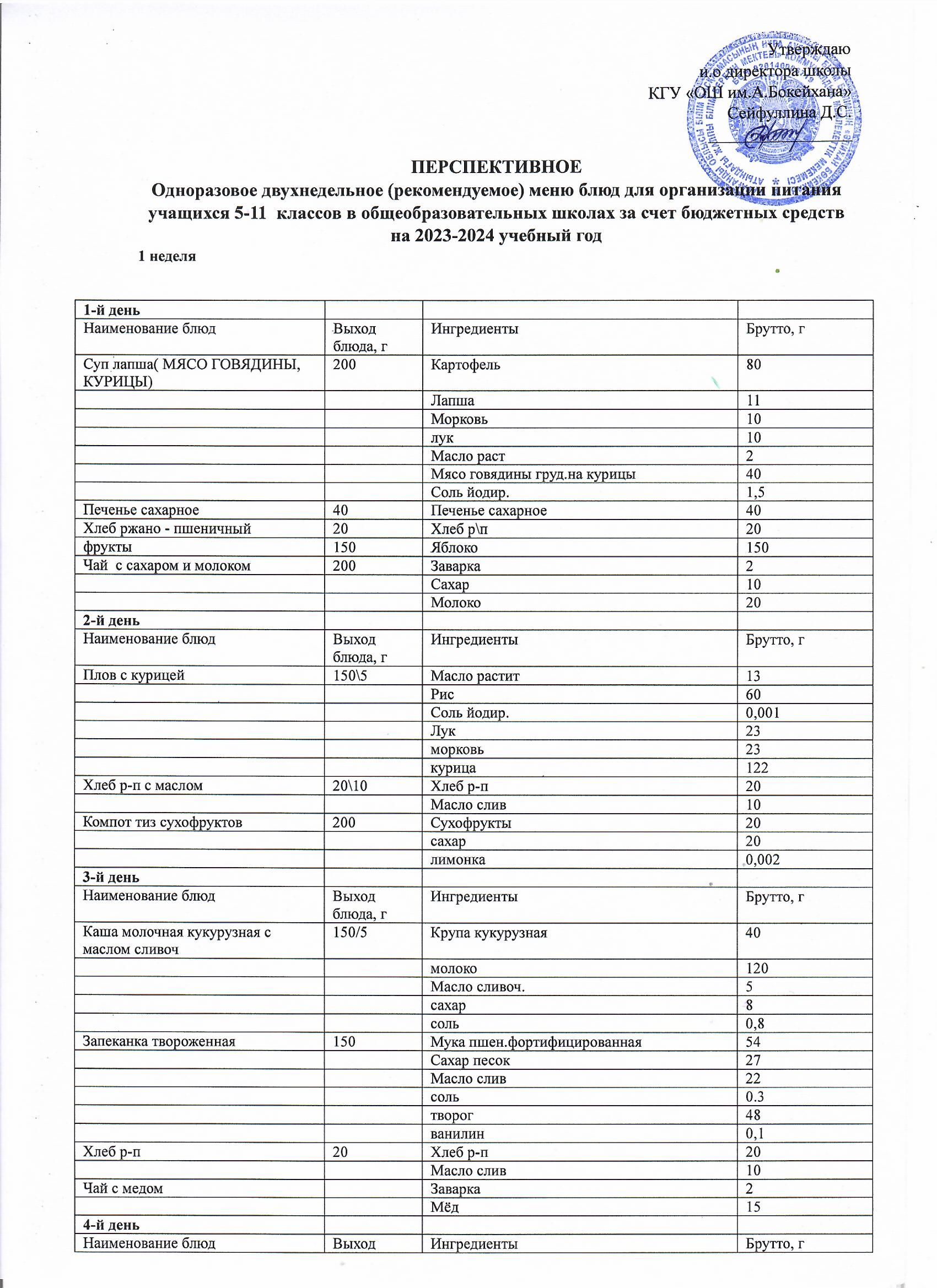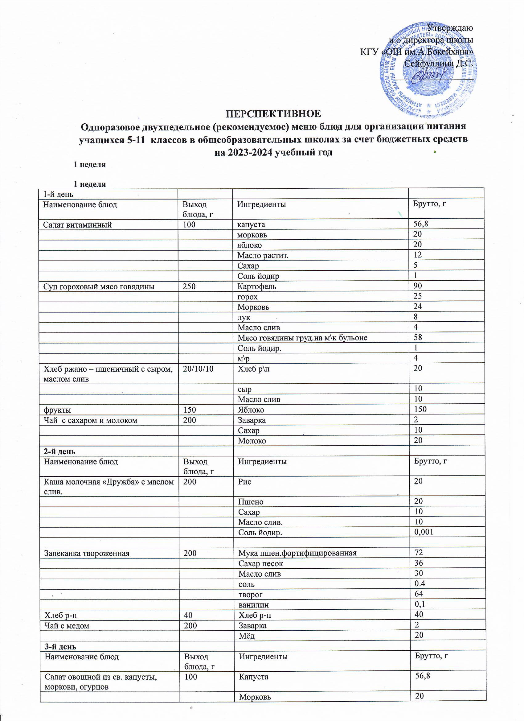 Перспективное двухнедельное меню блюд для организации питания учащихся начальных классов а также 5-11 классов в КГУ ОШ им Алихана Бокейхана