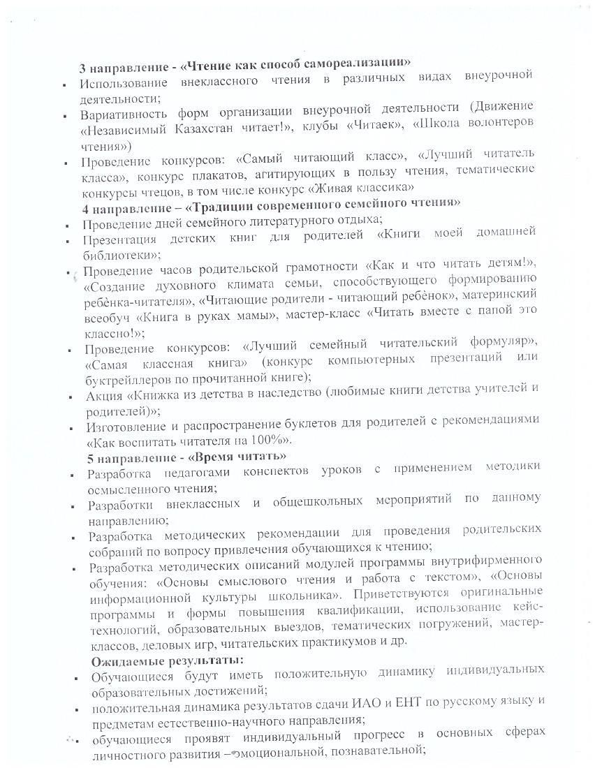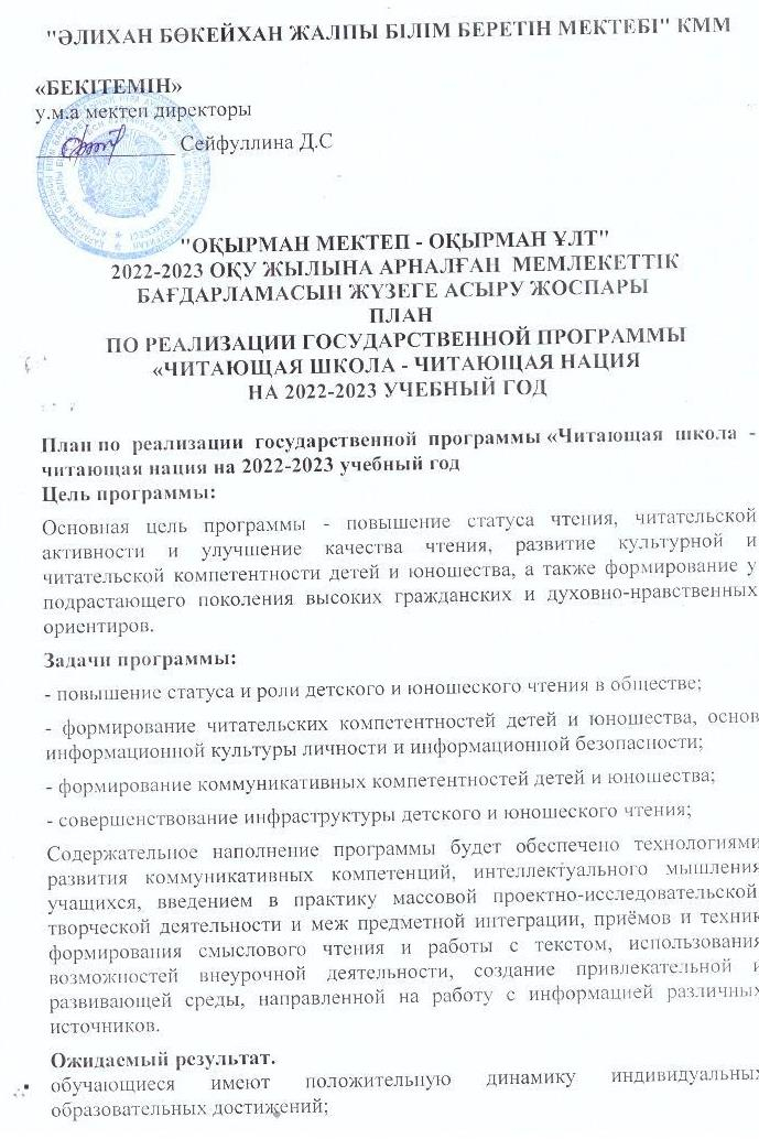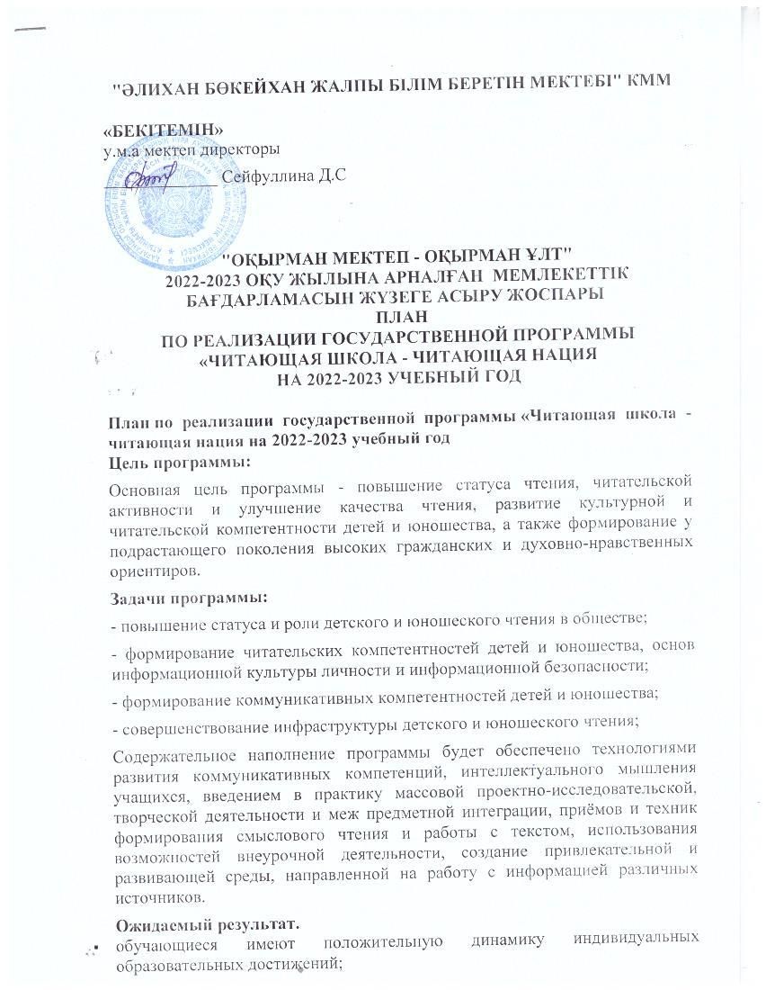 План работы по реализаций государственной программы "Читающая школа-читающая нация"
