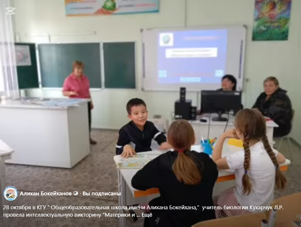 28 октября в КГУ “ Общеобразовательная школа имени Алихана Бокейхана,” учитель биологии Кухарчук Л.Р. провела интеллектуальную викторину “Материки и океаны”, среди учащихся 5…