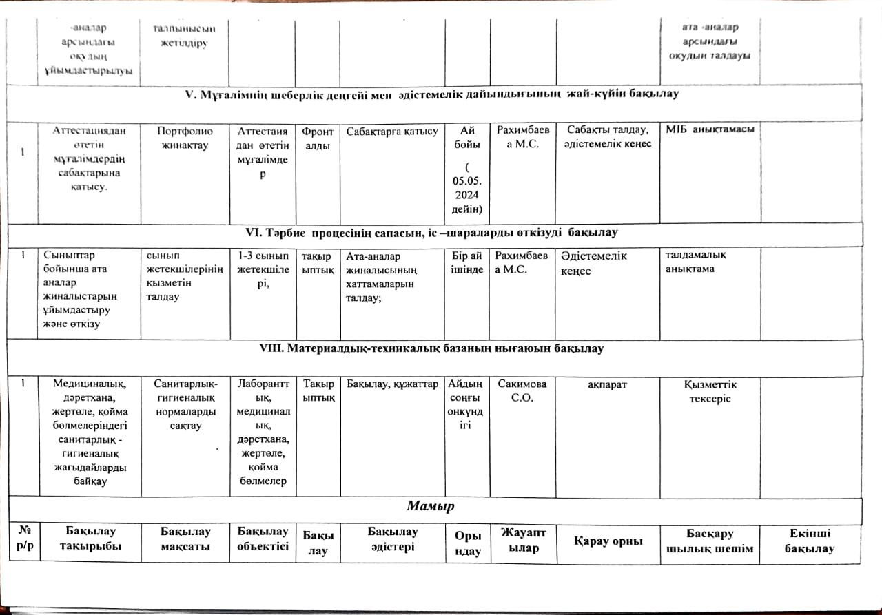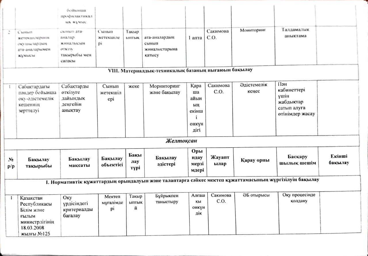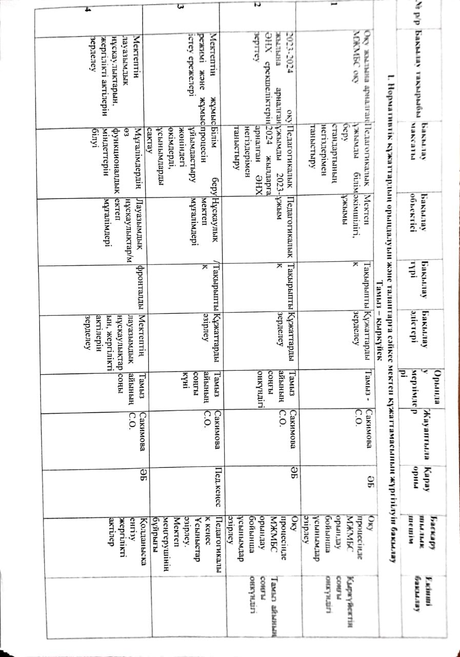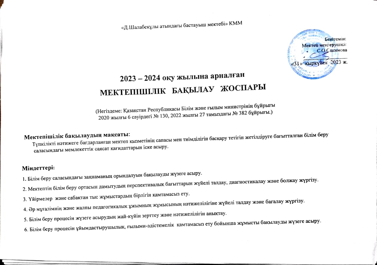 2023-2024 оқу жылына арналған Мектепшілік бақылау жоспары