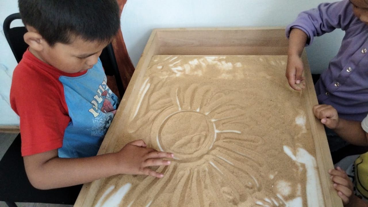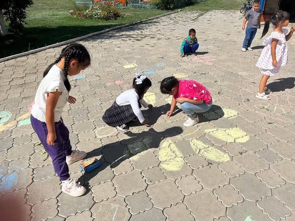 А.Асылбеков атындағы ЖББ мектебінің "Балбөбек" шағын орталығы. Жазғы сауықтыру іс-шаралардың жоспарына сәйкес "Құммен сурет салу".