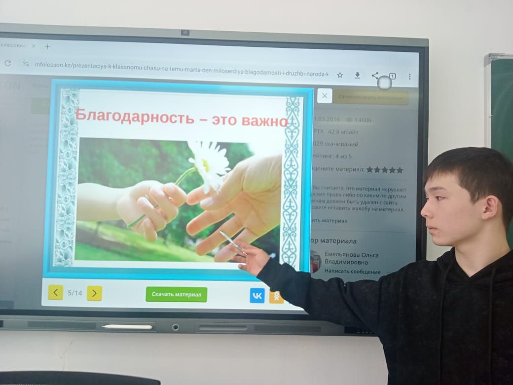 “Біртұтас тәрбие" бағдарламасының жобасы аясында 3 наурыз күні «Алғыс - ізгі ниет» атты тақырыбында 9-11 сынып оқушылар арасында сынып сағаты және "Қауіпсіздік сабағы&…