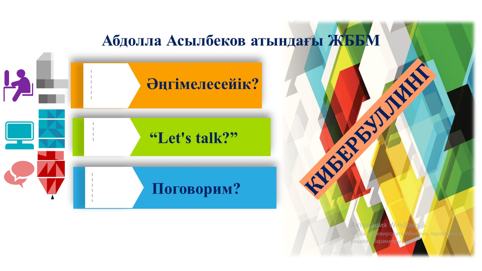 «Кибербуллинг дегеніміз не? Әңгімелесейік?, Let’s talk?, Поговорим?»