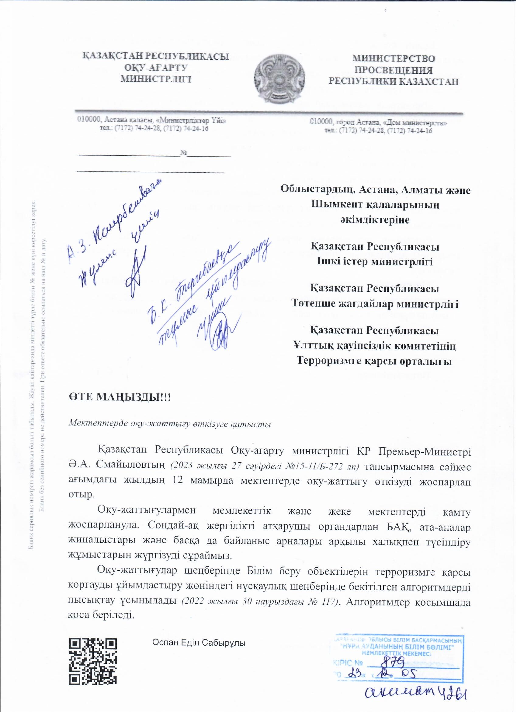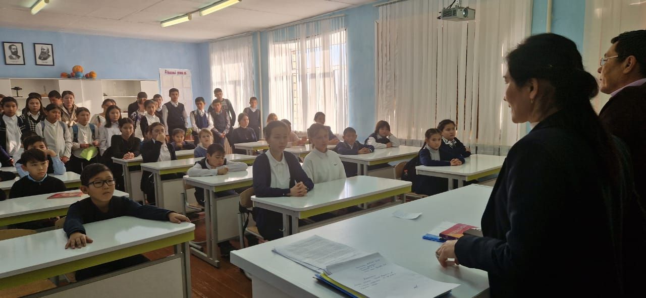07.12.2023 жылы мектепте директордың тәрбие ісінің орынбасары А. Б. Маугулова және терроризмге қарсы инспектор В.Г. Бахтияровпен 5-9 сынып оқушылары арасында "Терроризм актісі туралы көрінеу жа…