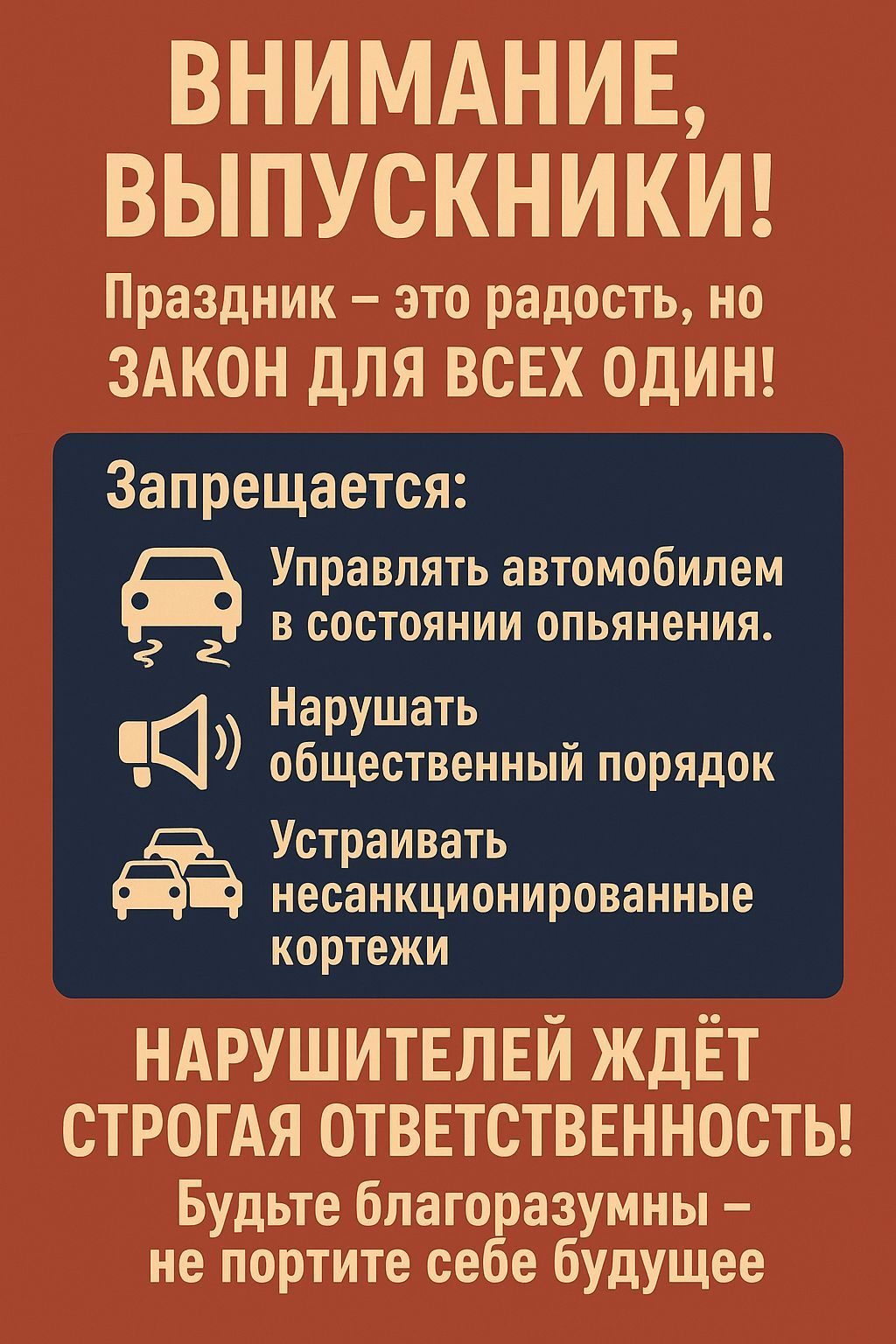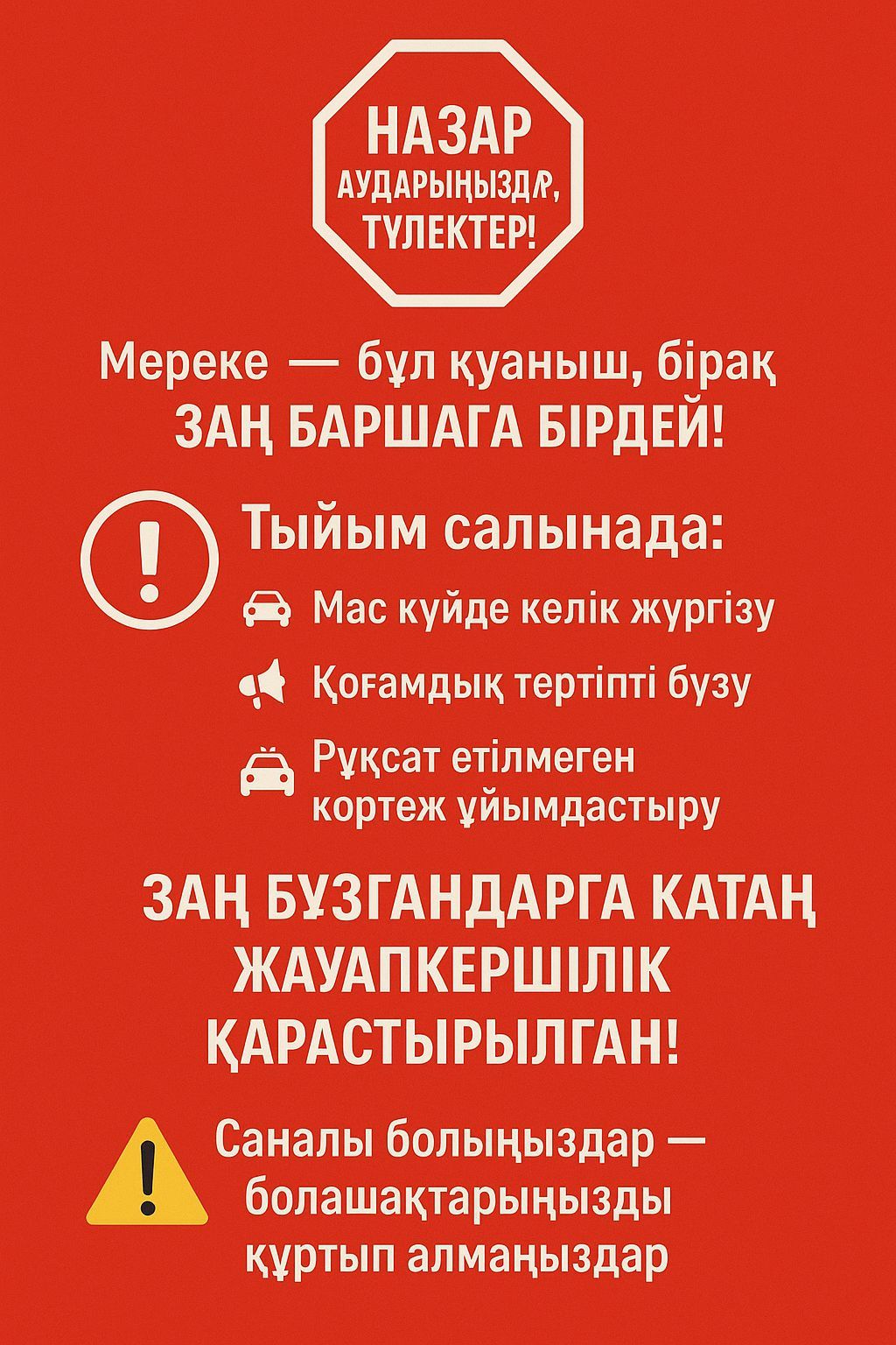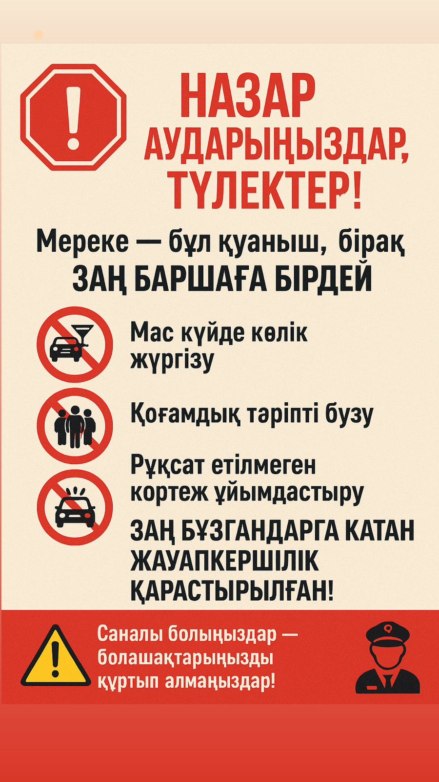 Түлектерге мерекелік кештен кейін қоғамдық тәртіпті сақтау, кешкі уақытта жүріп-тұруда сақ болу, ата-аналармен байланыста болу ескертілді.