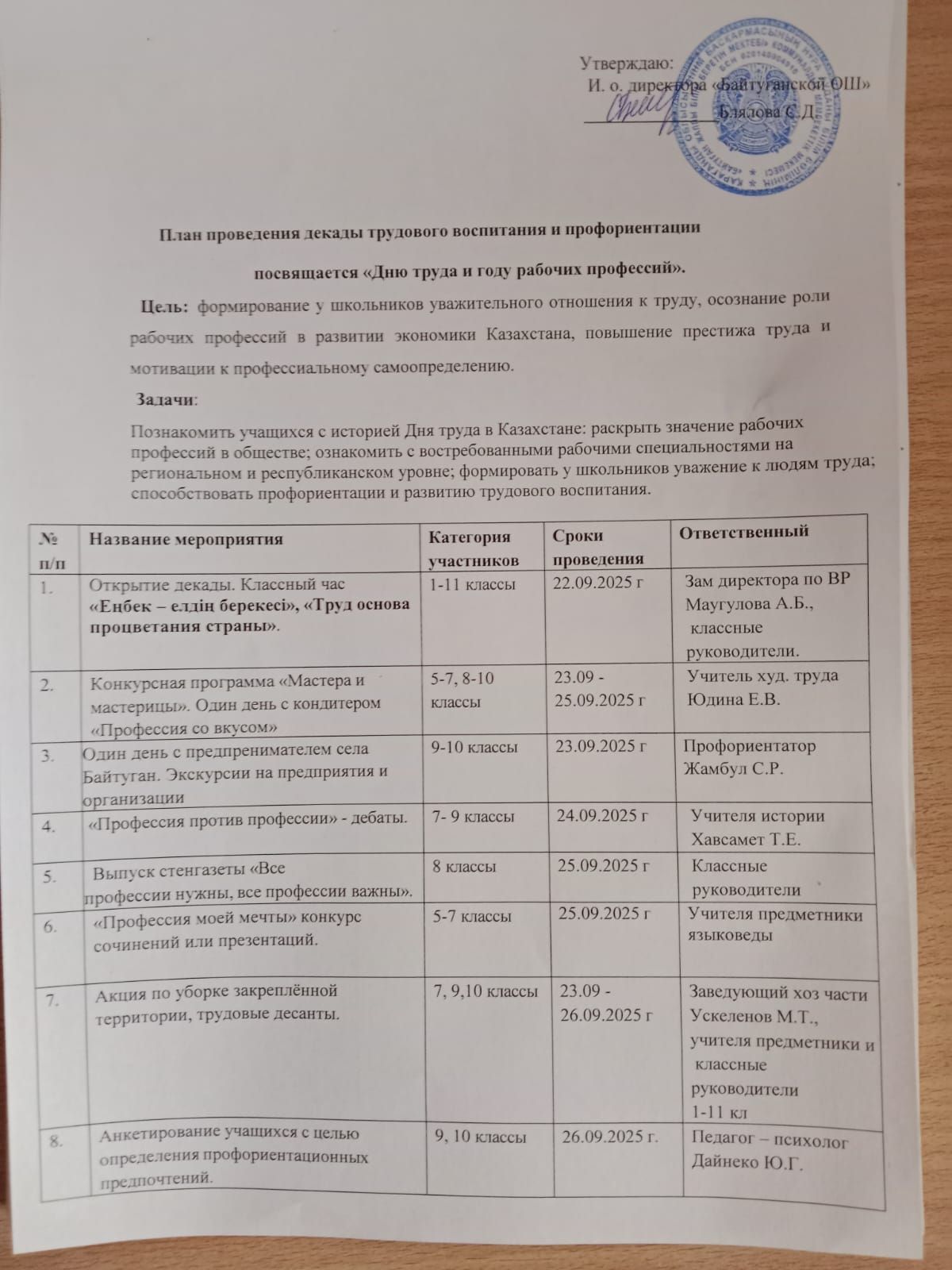 Байтуган ЖББ мектебінде 24.10.2025 куні кузгі каникул кезіндегі іс-шаралар жоспары бойынша директордын тербие жумысы женіндегі