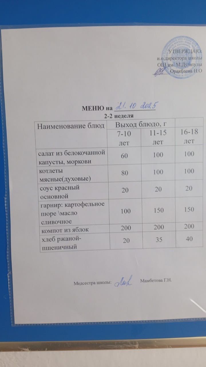 Мектеп оқушыларының тамақтануы туралы ақпарат. 2025 жылдың 11 қараша күні мектеп оқушыларына арналған күнделікті тамақтану рационы төмендегідей ұйымдастырылды.